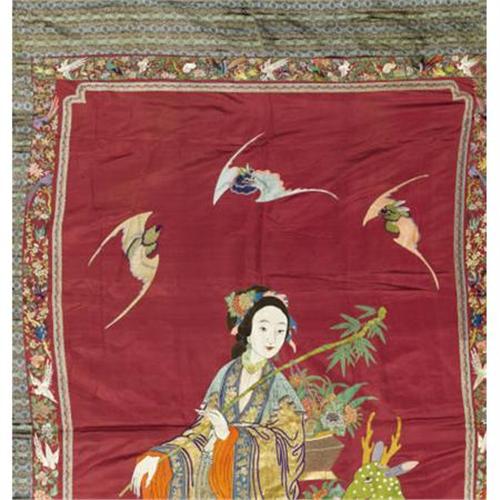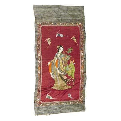 <B>A Chinese Textile Hanging</B></I><B><I> <BR></B></I></B></I>Unknown maker, China<BR>Circa 1900-1920<BR>Satin, silk, embroidery<BR>130 x 60 inches (330.2 x 152.4 cm)<BR>Unmarked<BR> <BR>The large Taoist hanging showing the immortal Lan T's ai-Ho carrying a basket of flowers with a deer at her side and five bats, with elaborate use of couched gold and stitched in orange, purple, pink, lime green, turquoise and white on a maroon satin ground, with a decorative border of embroidered birds and flowers.<BR><BR> <B>Condition Report:</B> Desiccation of fabric with areas of loss; loss of embroidery.<BR><BR><b>Shipping:</b> Requires 3rd Party Shipping (<a target="_blank" href="http://www.heritageauctions.com/common/shipping.php">view shipping information</a>)
