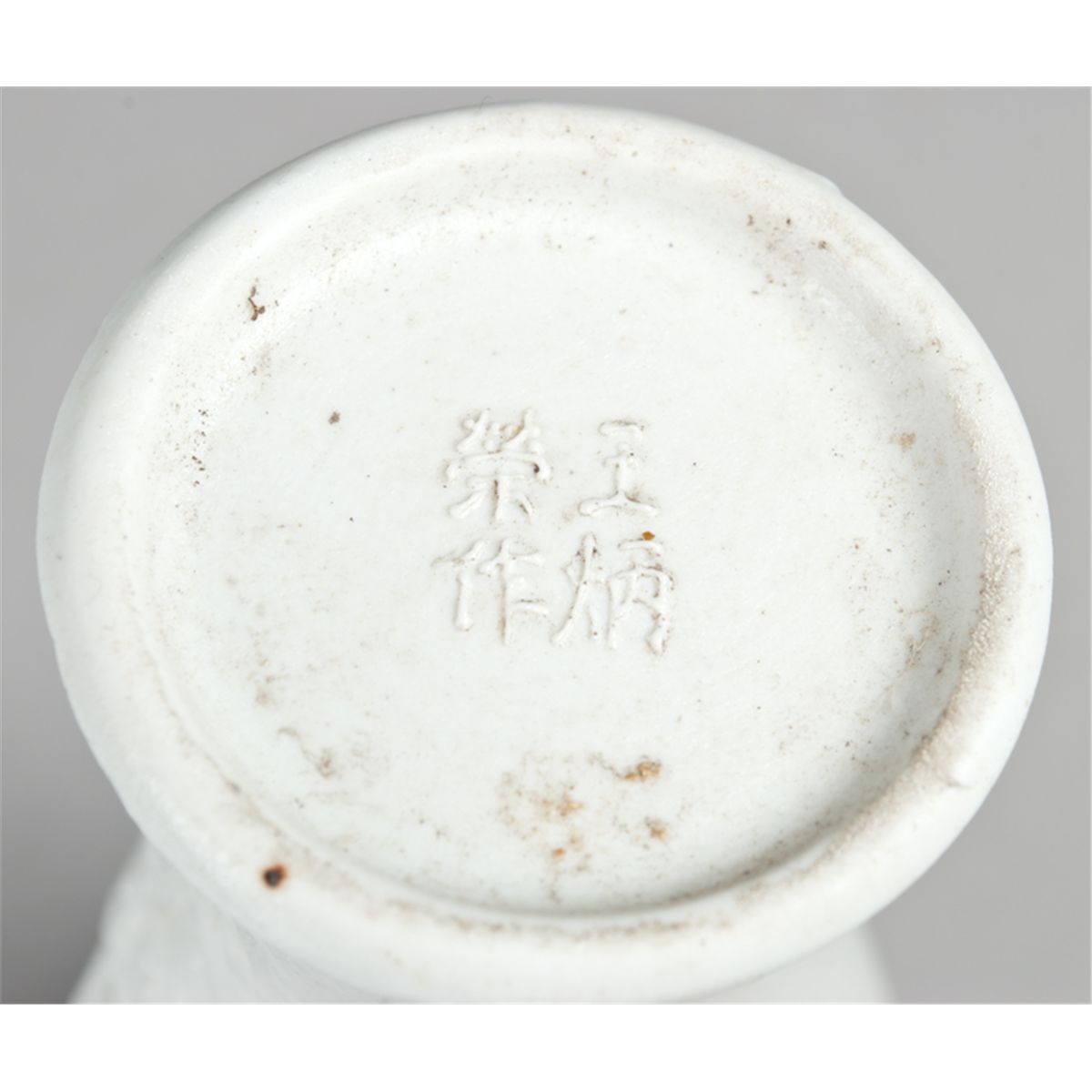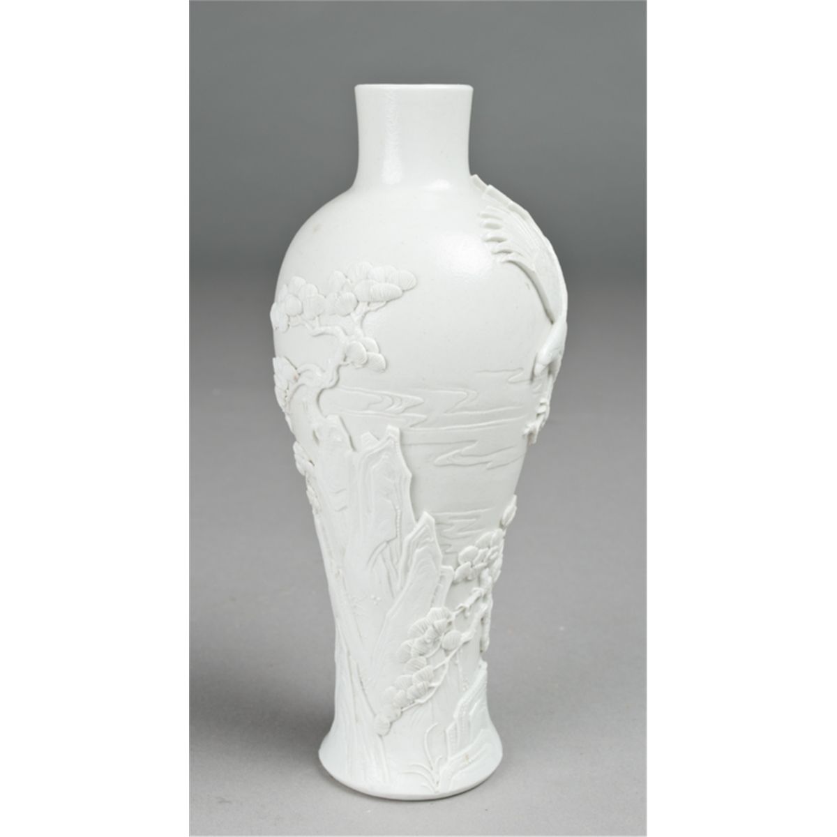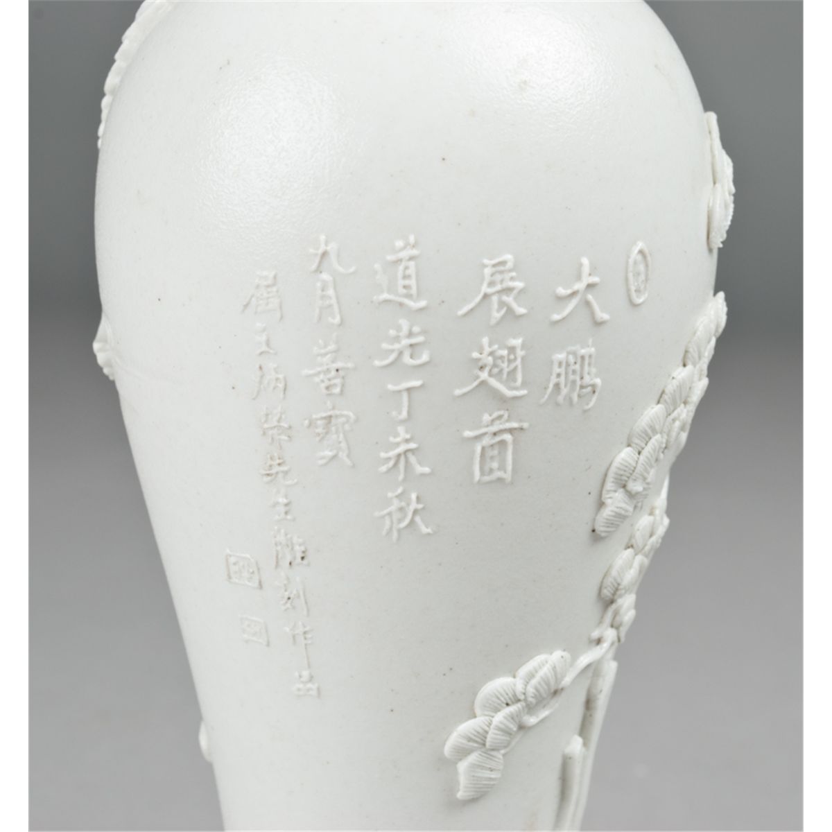 Finely molded to depict an eagle landing on a tree within a rocky landscape, the reverse with five lines of calligraphy with molded signature on the bottom 7.5"H. Private collection Toronto, Canada.