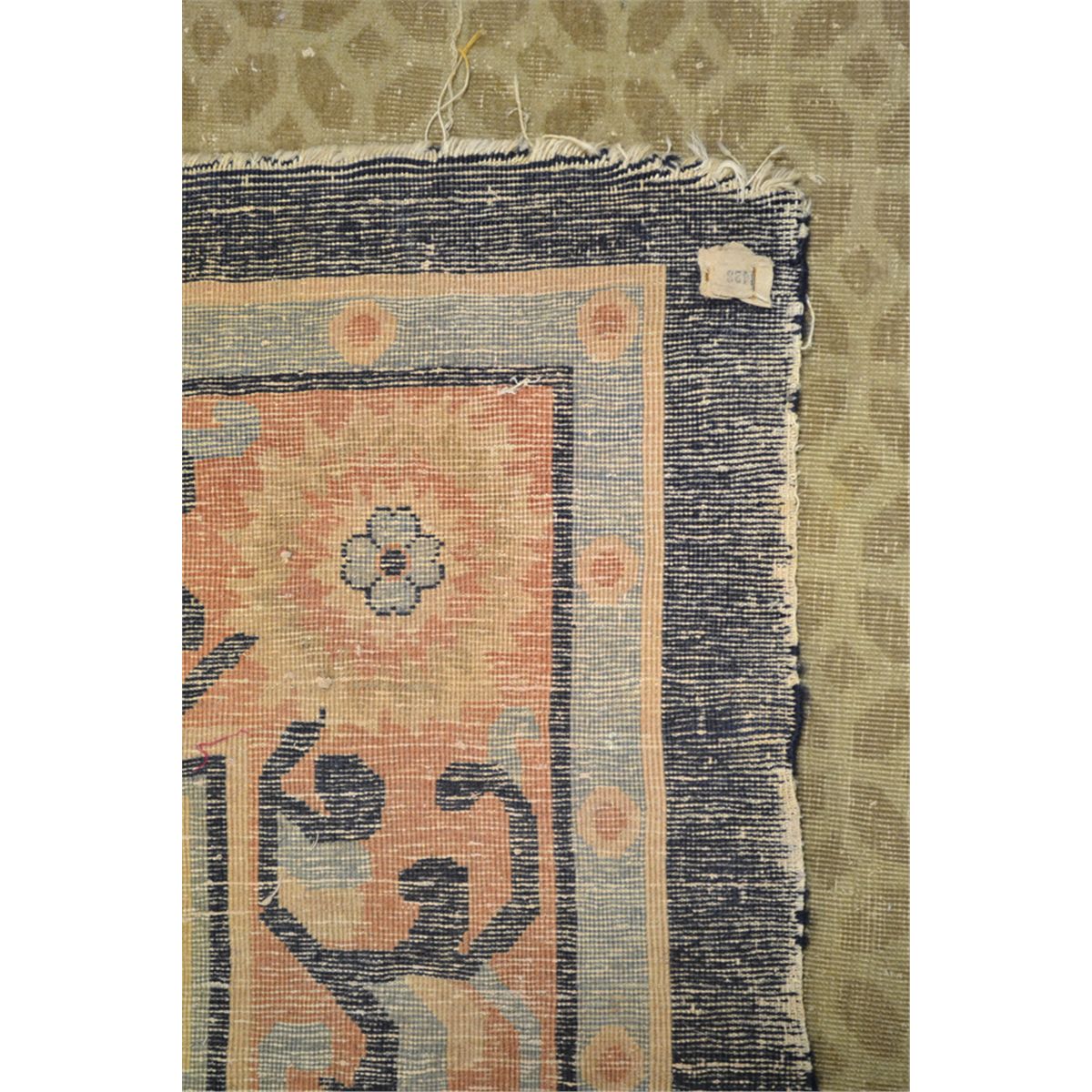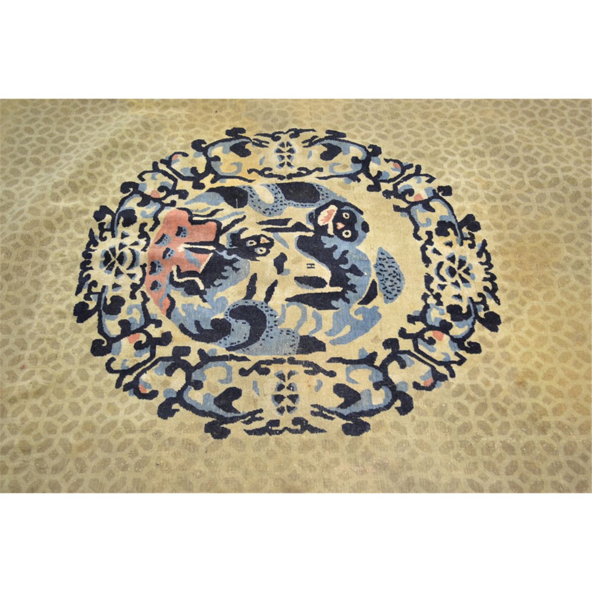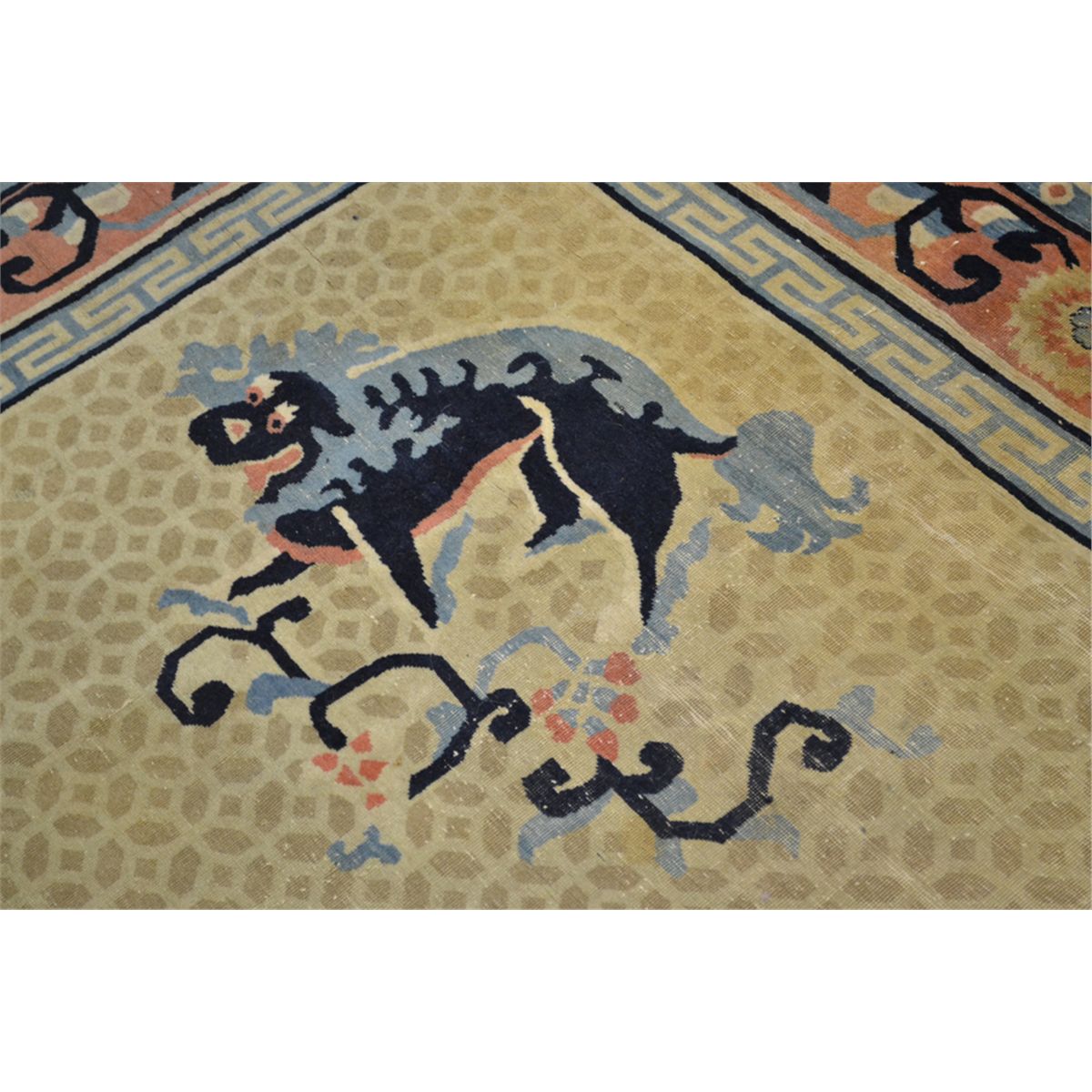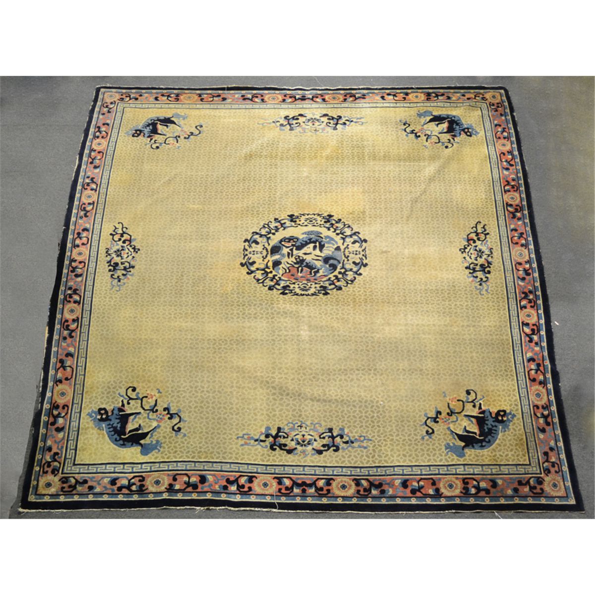 Very large, with foo dog medallion in center and smaller animal figures around edges, Greek key design and floral, in navy, light blue, pink and tan. 13' 6" x 11' 6", surface staining and fraying to edges. Circa early 1900-1910. Private collection Ft. Gratiot, MI.