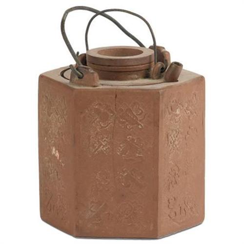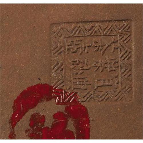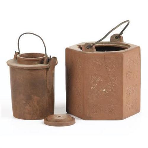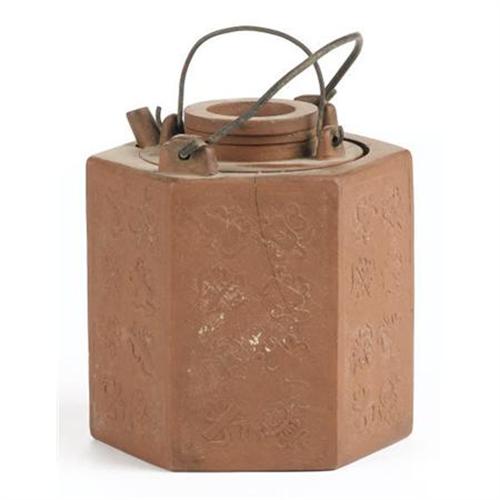 <B>A Chinese Yixing Stoneware Lidded Teapot<BR></B></I>Unknown maker<BR>Nineteenth Century<BR>Tall hexagonal form decorated with a floral motif, metal top handle<BR>Stamped seal on the underside<BR>4.5 inches high x 3.7 inches wide x 3.7 inches deep <BR><BR><b>Shipping:</b> Requires 3rd Party Shipping (<a target="_blank" href="http://www.heritageauctions.com/common/shipping.php">view shipping information</a>)