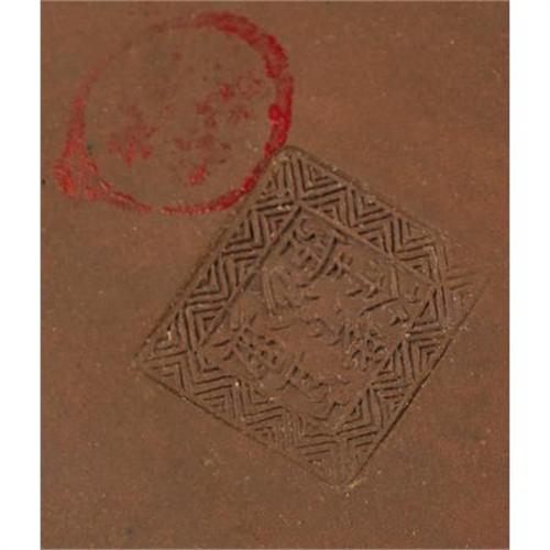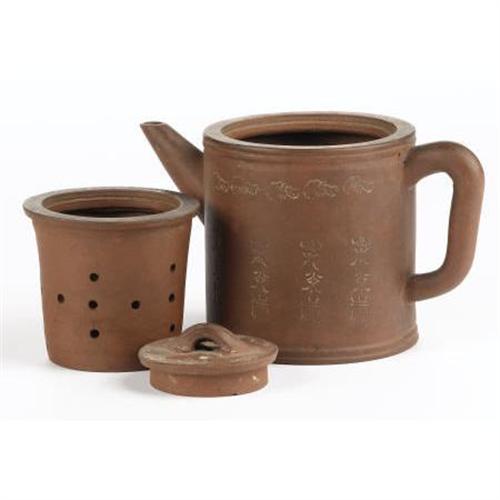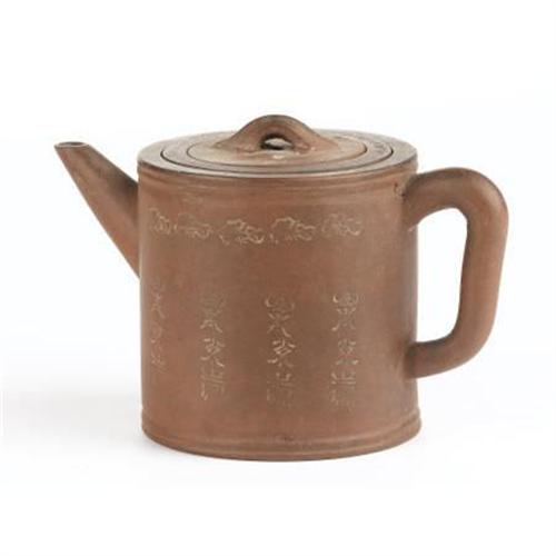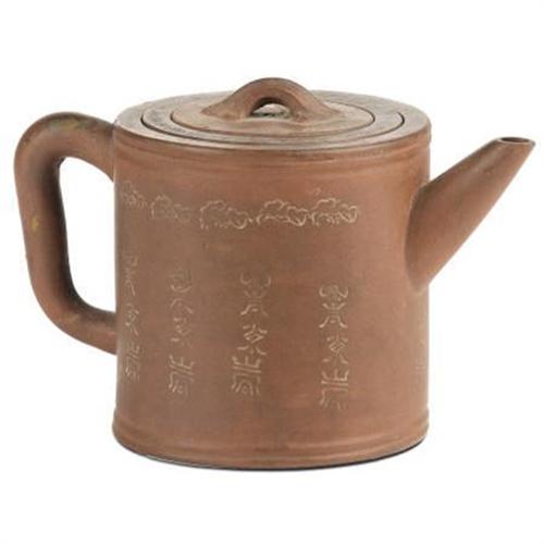 <B>A Chinese Yixing Stoneware Lidded Teapot<BR></B></I>Unknown maker<BR>Nineteenth Century<BR>Decorated with calligraphy around the body with leaf design above, led decorated with scrolls and bats<BR>Stamped seal on the underside<BR>4.2 inches high x 6.2 inches wide x 3.7 inches deep <BR><BR><b>Shipping:</b> Requires 3rd Party Shipping (<a target="_blank" href="http://www.heritageauctions.com/common/shipping.php">view shipping information</a>)