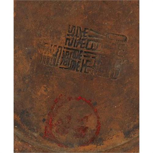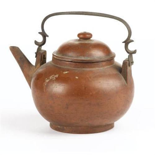 <B>A Chinese Yixing Stoneware Lidded Teapot<BR></B></I>Unknown maker<BR>Nineteenth Century<BR>Rounded in form with straight spout and metal top handle<BR>Stamped seal on the underside<BR>4.7 inches high x 6.5 inches wide x 4.5 inches deep <BR><BR><b>Shipping:</b> Requires 3rd Party Shipping (<a target="_blank" href="http://www.heritageauctions.com/common/shipping.php">view shipping information</a>)