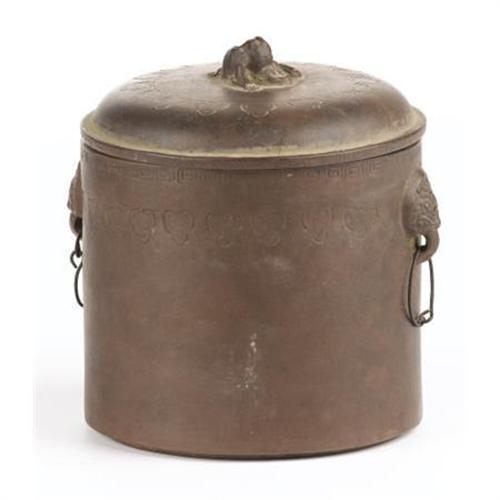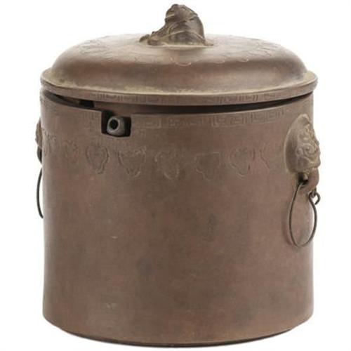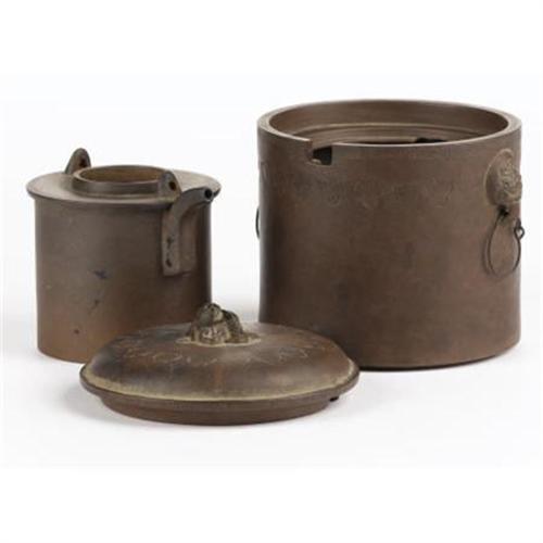 <B>A Chinese Yixing Stoneware Lidded Teapot<BR></B></I>Unknown maker<BR>Nineteenth Century<BR>Cylindrical form outer body with trifoil design, lid with lizard type creature, internal cylinder with spout and recessed lid<BR>Stamped seal on the underside<BR>5 inches high x 4.5 inches wide x 4.2 inches deep <BR><BR><b>Shipping:</b> Requires 3rd Party Shipping (<a target="_blank" href="http://www.heritageauctions.com/common/shipping.php">view shipping information</a>)