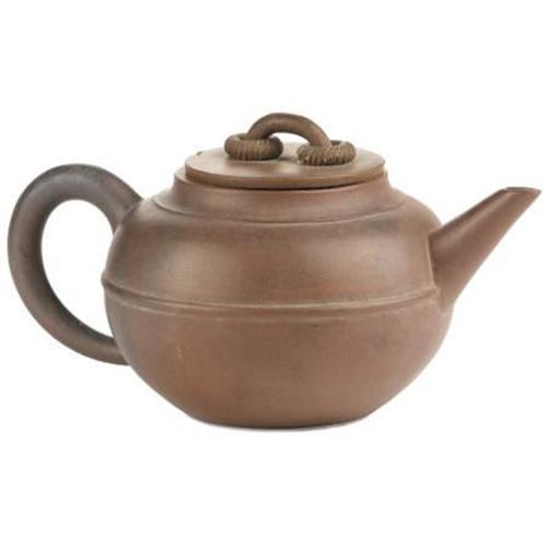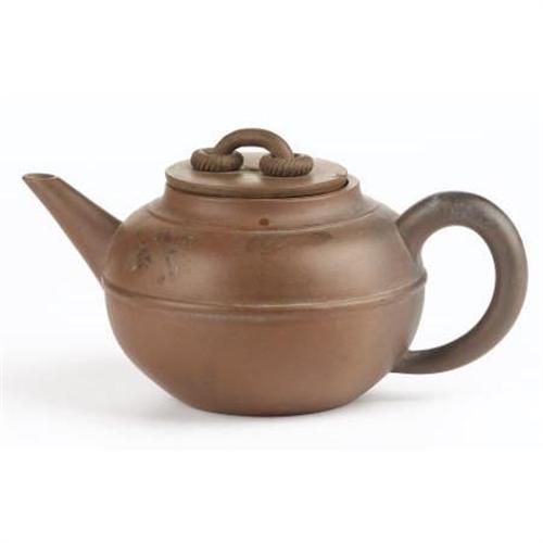 <B>A Chinese Yixing Stoneware Lidded Teapot<BR></B></I>Unknown maker<BR>Nineteenth Century<BR>Decorated with a single moulded band around the waist<BR>Stamped seal on the underside<BR>4 inches high x 7.5 inches wide x 5 inches deep <BR><BR><b>Shipping:</b> Requires 3rd Party Shipping (<a target="_blank" href="http://www.heritageauctions.com/common/shipping.php">view shipping information</a>)