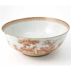 A Chinese export porcelain punch bowl, Chien Lung, continuously painted with scenes from an Aesop fable in iron-red, rivet-repaired, 11.5in. £300-500