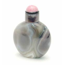 A Chinese grey and white thumb-print chalcedony snuff bottle, of flattened rounded form, with stopper, 2.5ins £150-250