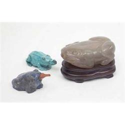 A Chinese jade snuff bottle in the form of a toad, 3ins (lacking stopper), a similar hardstone bottle, 2ins and another in turquoise, 2ins £100-150