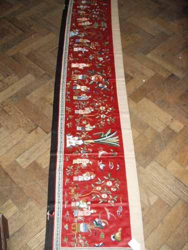 A Chinese red silk frieze panel worked with figures, 43cms x 203cms £80-120