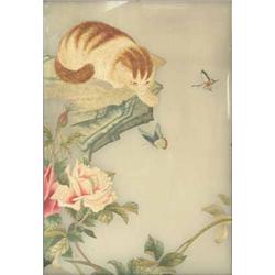 A Chinese reversible embroidered panel, depicting a cat and 2 butterflies on a rose strewn ledge, framed between 2 sheets of glass 1ft 2ins x 10ins £40-60