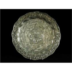 A Chinese silver dish, with a central chased panel of oriental figures, within bamboo and bird decoration, the wavy border pierced and chased with further oriental figures, on three feet, marked HM 90, 31.5cm diameter Est. 400/600