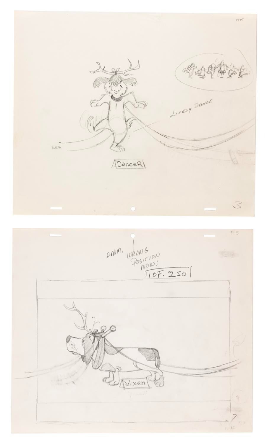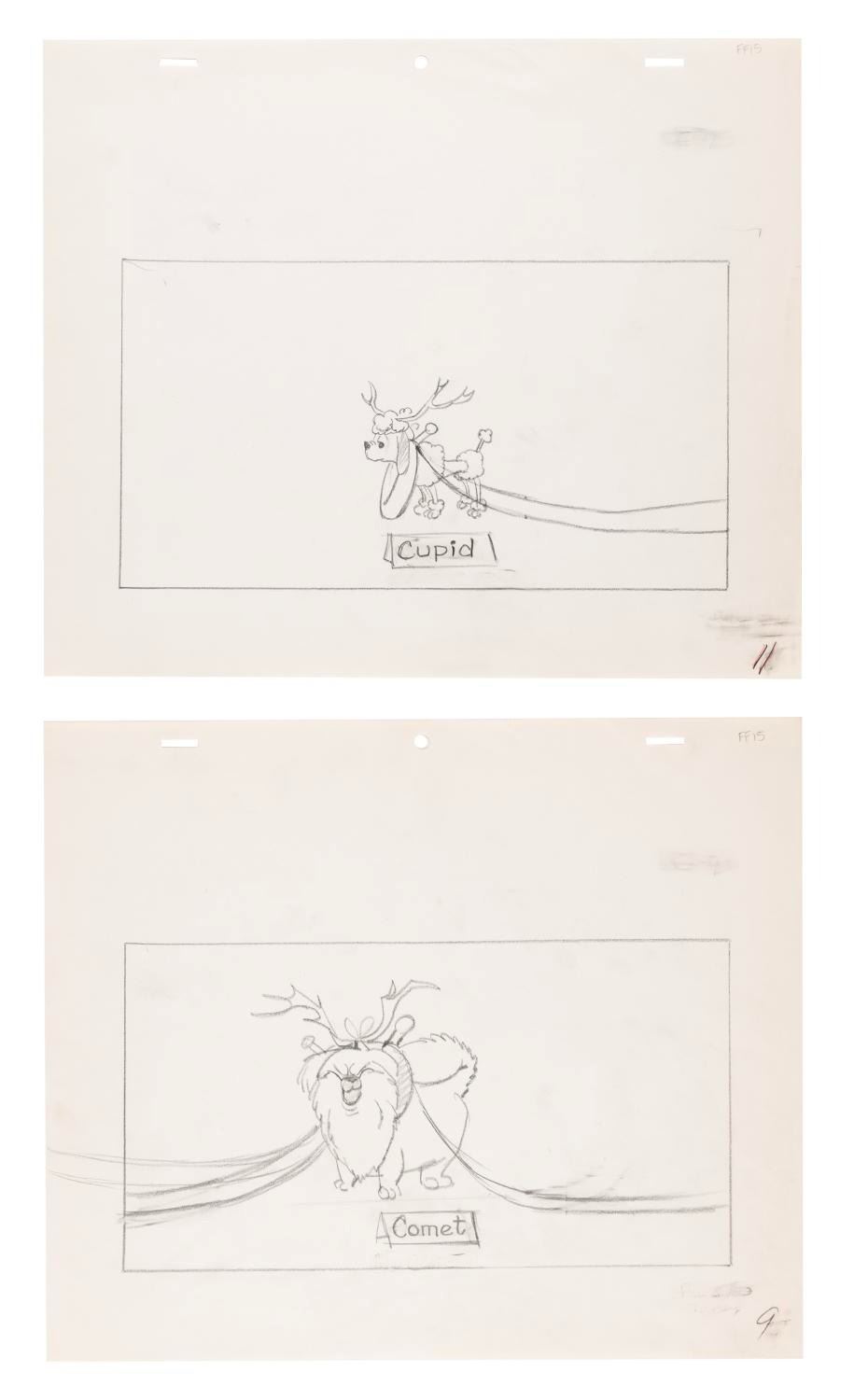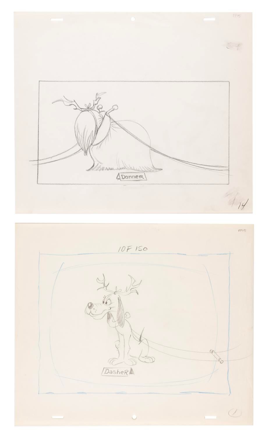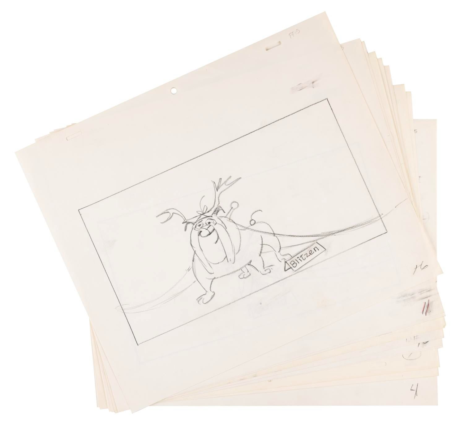(Chuck Jones/Bagdasarian, 1981) A set of ten drawings of dogs dressed as Santa's reindeer from "A Chipmunk Christmas" in 1981. With various image sizes on 10.5" x 12.5" animation paper, the graphite drawings are in very good condition with light smudges and wear from handling and original production use.