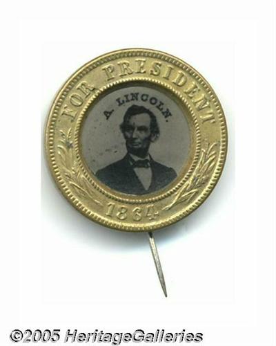 <B>A Choice 1864-dated Abraham Lincoln Pinback Ferrotype</B></I> Beautiful "minty" example of this classic variety, with original pin and clasp on reverse. Obverse of Sullivan's unpictured AL 1864-97, a rarer variant with smaller portrait than on the similar AL 1864-96; but Sullivan's example had Johnson reverse rather than a pin. A great "type" example from the tougher 1864 campaign, and especially nice as an exact McClellan mate is to be found. Diameter 25 mm. Lot:257
