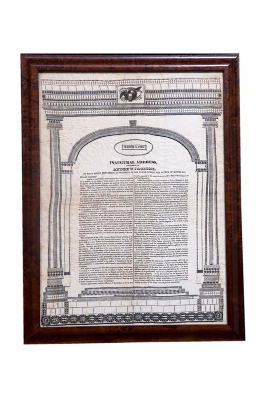 [ANDREW JACKSON]. A choice silk broadside of Andrew Jackson's first inaugural address. Framed to an overall size of 16” x 21”. March 4, 1829. Printed on silk by Richard C. Langdon, Xenia, Ohio. Complete text of Andrew Jackson’s address. A lovely graphic broadside depicting an eagle at top supported by ornate pillars with wonderful, fine detail. Some minor light dampstaining mentioned for accuracy. Overall a nice clean example of this rare early silk. Fine.
