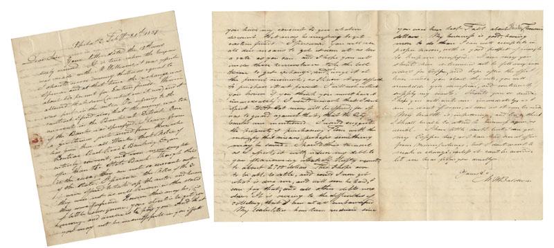 Matthias William Baldwin (1795 - 1866) An American manufacturer of steam locomotives. He opened his machine shop in 1825. The business grew to become Baldwin Locomotive Works, one of the most prolific and successful locomotive manufacturing firms in America. ALS. 2 pages. Phila Feb 21st 1839. “Dear Sir, Your letter dated the 19th was duly received. It is true when the bargain was made with M. William it was expected I should receive money – equal to – and at that time the exchange was about 1 ½ peer cent for Eastern funds. We were allowed that sum ( or what – it was) and it was put in the -. On referring to the contract I find also, that the money was to be current in the Banks of Detroit. One of the Banks was -. I learn from a Gentleman just arrived from – who has been there all Winter, that Notes of –-Road & Banking Co, an - - and even more sought after – the State Bank. Though this is the case, they are not – currant out of the state. I – the notes of the - - - offered to take with the note and bear they were not as well known in other states. They were-. – this may be, is of little consequence, your object is to get your money and mine is to pay you. And that you may not be unsuccessful in you efforts. You have my consent to give whatever discount that may be – to get - -. I presume you will uses all due – to get at – at as low a rate as you can. And I hope you will under these circumstance take the best – to get exchange and not - it at the present moment, as I know a very difficult to purchase – at -. I will not – you however if you think you must have it immediately. I would remark that I - - - - money will be offered; for it was to grand against that , that the City Banks – mentioned. I would suggest that property of purchasing Flour with the money by his means; perhaps something may be saved. - - turnout as I expect, it will – my debt to your after reserving what - - regards to about 2700 dollars. This I hope soon to be able to settle, and could I now get what is due me, and will soon be hard, I can pay that, and all other debts more due. It is owing to the difficulties of collecting, that I am at all embarrassed.My liabilities have been – since you were here last Fall about Thirty Thousand dollars . My – is good, having mores to do – I can - complete in proper – with a good p of enough to help me – I am sorry your shout – determined not to fell away under orders for Copper, and hope often the offered I have made you about the note, you will reconsider you -, and continue to supply my wants. Should you so decide I hope you will write me immediately as I am in want of some, as soon as it can be made. My health is improving, and I - think I shall be able to attend to – again as usual. I have little doubt but I can give my Copper – as I have had –offer from manufacturers, - but I don’t want to make a change - cant be avoided. Let me hear from you – Yours truly, M. W. Baldwin.” Fine content and excellent condition letter for this important railroad related autograph.