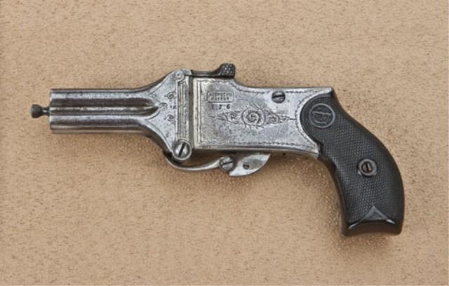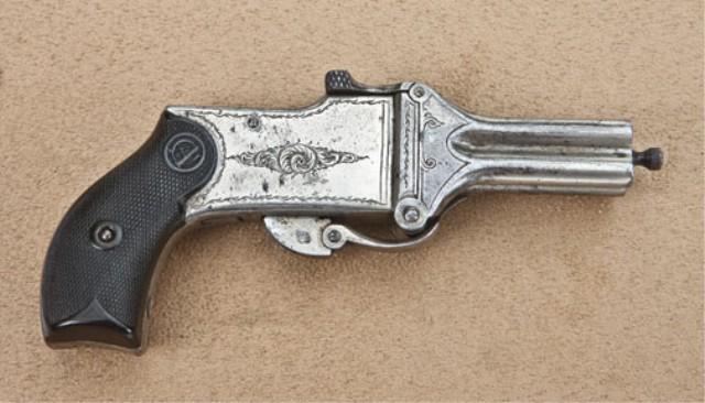 A. Chu Chu, 4-shot double-action pepperbox derringer, 5.5mm rimfire, or approx. .22 caliber. Nickel finish, hardrubber grips, serial #176. The pistol measures 5-1/2” overall with 2-1/4” barrel cluster. The pistol shows approx. 50-70% drifting nickel finish. The left side of frame shows patent marking and small cartouche and the pistol shows small Belgian proofs. The condition is good to very good with Belgian grips, the pistol is loaded by tipping the barrel forward and releasing a spring catch at top. A sharp’s type internal firing pin is retained and the pistol is fired double-action. Circa 1870’s to 80’s. A desirably oddity pistol with a folding trigger for concealment. Seldom seen. From the Robert Petersen Collection. Est: $750 - $1,500