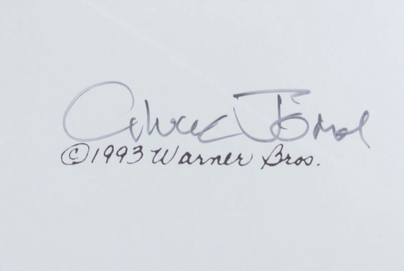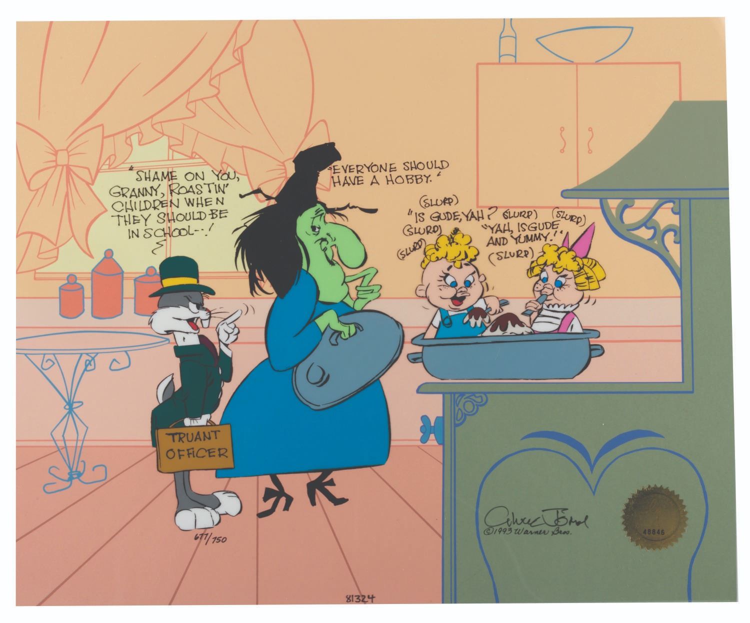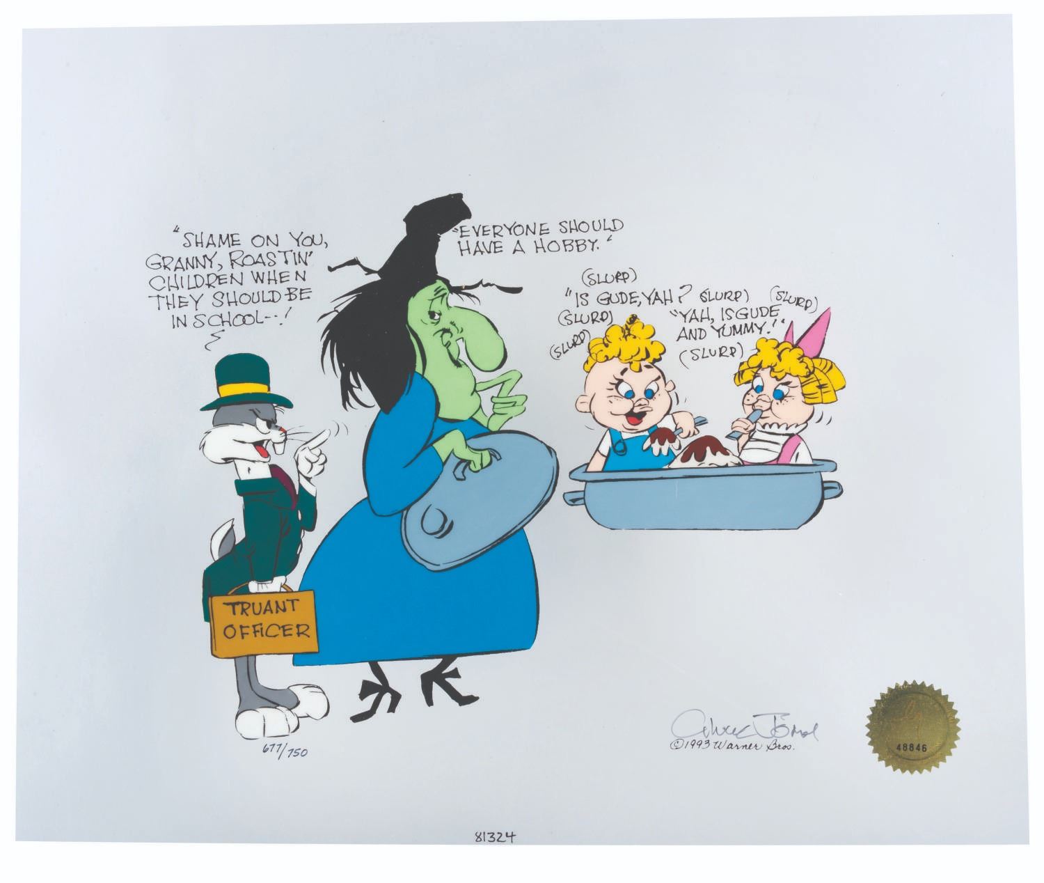 (Warner Bros., 2002) A hand-painted limited-edition cel of Bugs Bunny, Hazel, and Hansel & Gretel titled “Bugs & Witch Hazel: Truant Officer.” The cel is numbered 677 out of 750 and has been hand-signed by animation legend Chuck Jones. Measuring 13.5” x 16.5”, the cel is in fine condition.