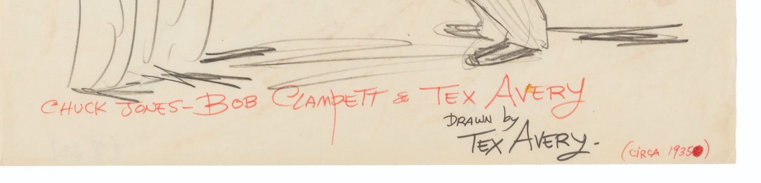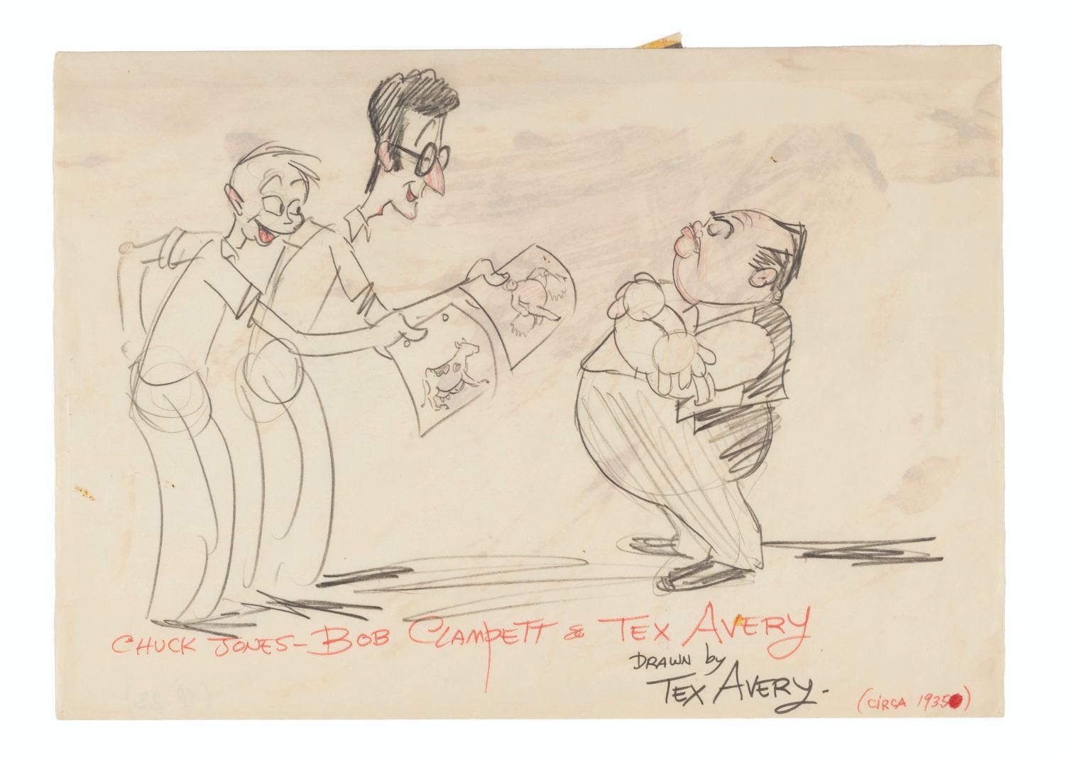 (Avery, 1935) A studio gag drawing by Tex Avery featuring Bob Clampett, Chuck Jones, and himself. Accomplished in graphite and colored pencil, and measuring 9.5” x 12” the drawing is in fair condition with the top 1” of the page folded over the back and bearing a “Courtesy of the Bob Clampett Collection” stamp, pinholes and a stain along the left edge, adhesive residue on the reverse which is visible on the front, and light discoloration from age.