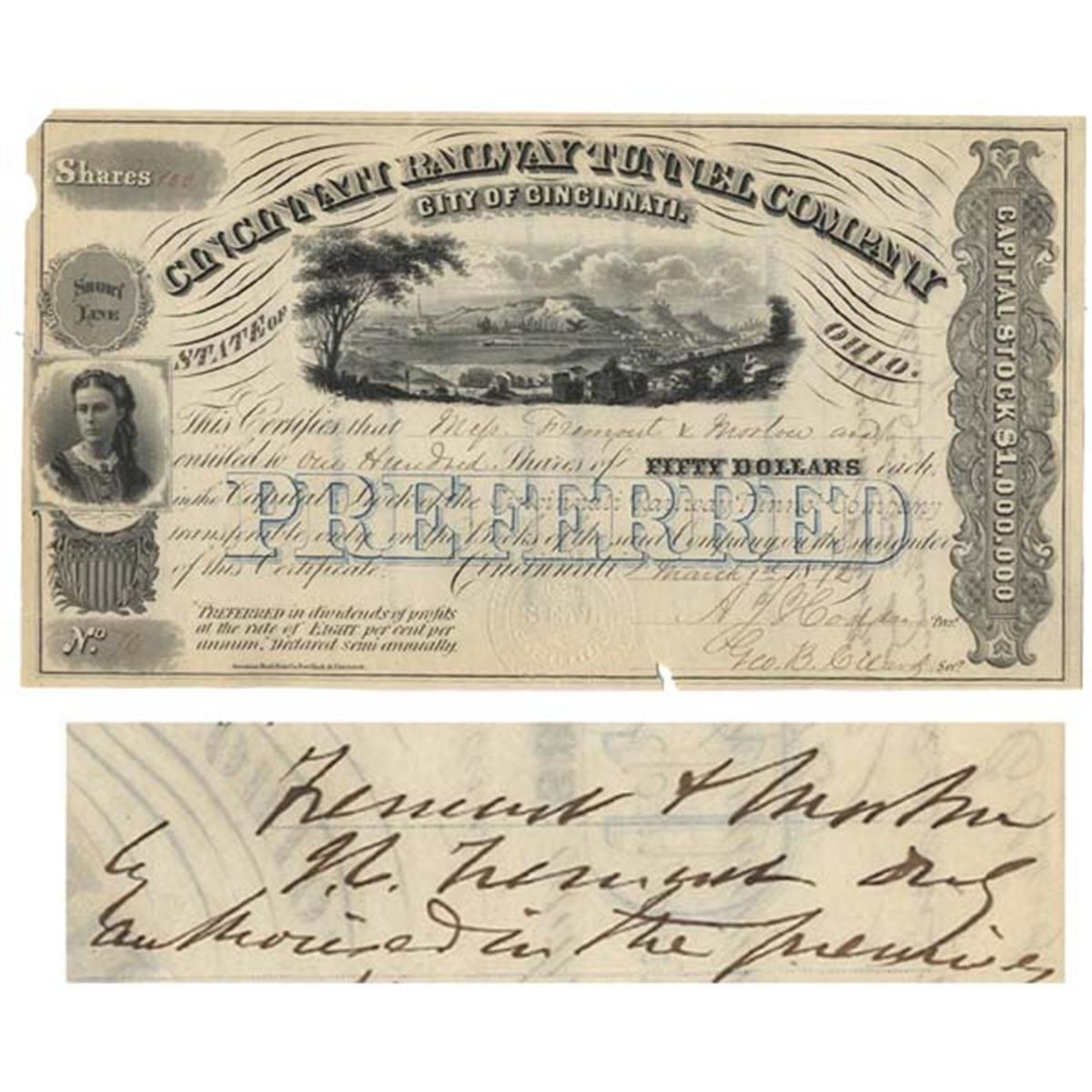 1872, Cincinnati. Certificate for 100 preferred shares issued to JOHN FREMONT and signed by him on the verso. Fremont (1813-1890) was an explorer and a Civil War Union general. He was the Republican Party’s first candidate and at the beginning of the Civil War, he commanded the Union Army's Western Department. His ill-advised proclamation confiscating the property of rebelling Missourians and emancipating their slaves soon caused his resignation. After the war, Fremont became interested in Western railroads but, after a series of disastrous ventures, lost both his fortune and reputation. Black on white paper. Top center engraved vignette of Cincinnati and left side vignette of a young woman. A small edge chip at bottom center and slight loss of paper at upper left corner. Uncancelled and in very fine condition.