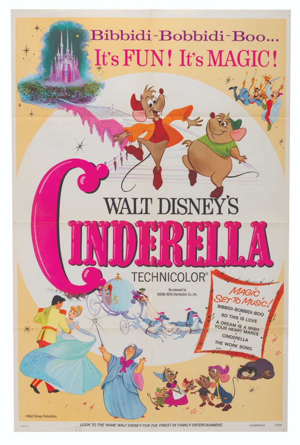(Disney, 1973) A one-sheet for the 1973 theatrical re-release of "Cinderella." Measuring 27" x 41", the poster displays in very good condition with creases, wear along the original folds, scuffs, and adhesive residue at the bottom.