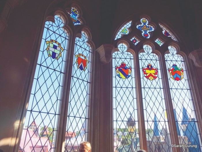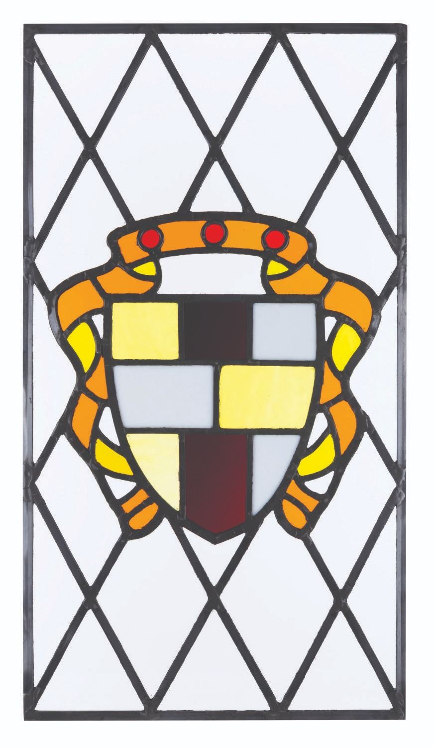 (Walt Disney World, 1971-1990s) A stained-glass window from Cinderella’s Castle. The centerpiece of the Magic Kingdom houses Cinderella’s Royal Table restaurant, originally known as King Stefan’s Banquet Hall. 40 coats of arms are featured decorations on the walls and the stained-glass windows carry designs based on heraldry. This crest panel was displayed high in the large windows of the banquet hall. After being removed and replaced, this crest was carefully restored to its original pattern with some lost pieces replaced. Measuring 17.25” x 31.5, the stained-glass window is in very good to fine condition.