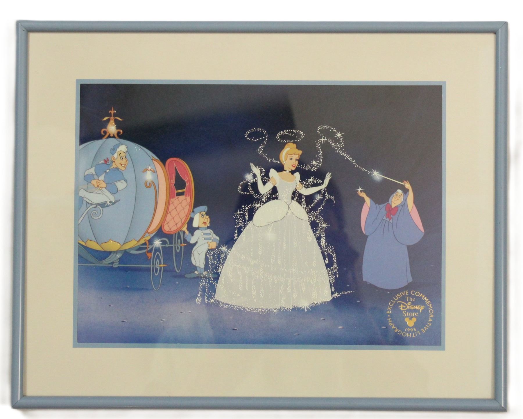 This Disney Store Exclusive lithograph from 1995 features Cinderella, her Fairy Godmother and two coachmen. This lithograph is framed and matted and measures 14.25" x 11.25".