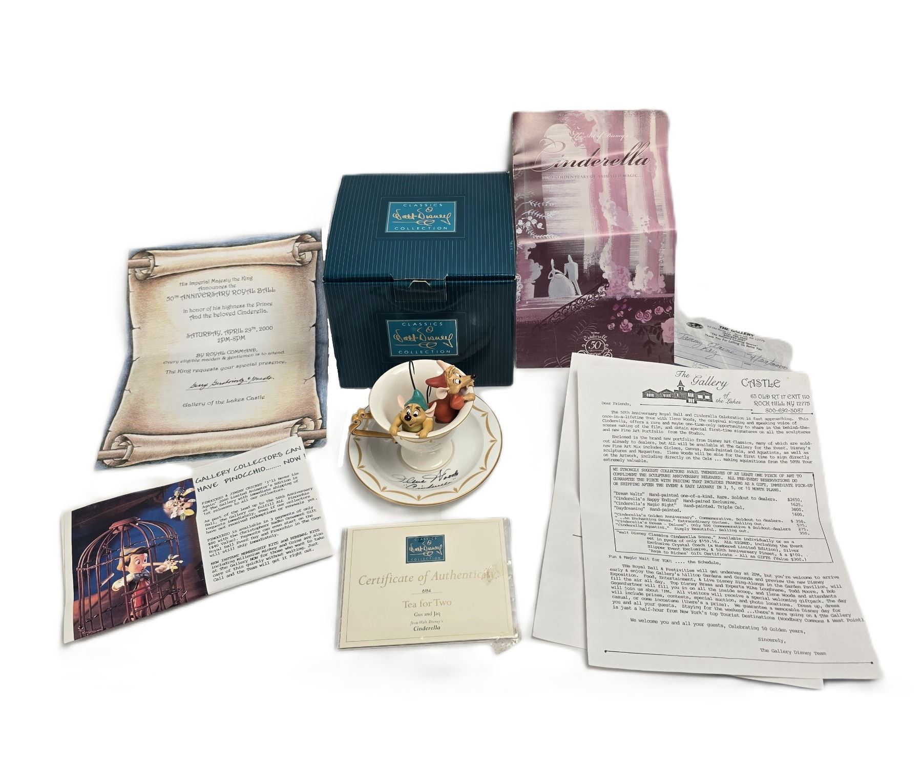 (WDCC, 1999) This is a Walt Disney Classics Collection Gus and Jaq “Tea for Two” . This figurine was only available for two days at the Fall Open House Figurine Event November 13th and 14th of 1999. This piece is numbered 8134. It is autographed on the bottom “Ilene Woods” and “Cinderella” WDCC #1200947. COA included. The saucer is a 1999 Open House Event piece made my WDCC and Royal Doulton.It is autographed on top by Ilene Woods and reads “Ilene Woods “Cinderella””. It includes the original purchase receipt and all the original event paperwork. The total measurements are 11” x 10” x 9” and weighs 1lb 7 oz.