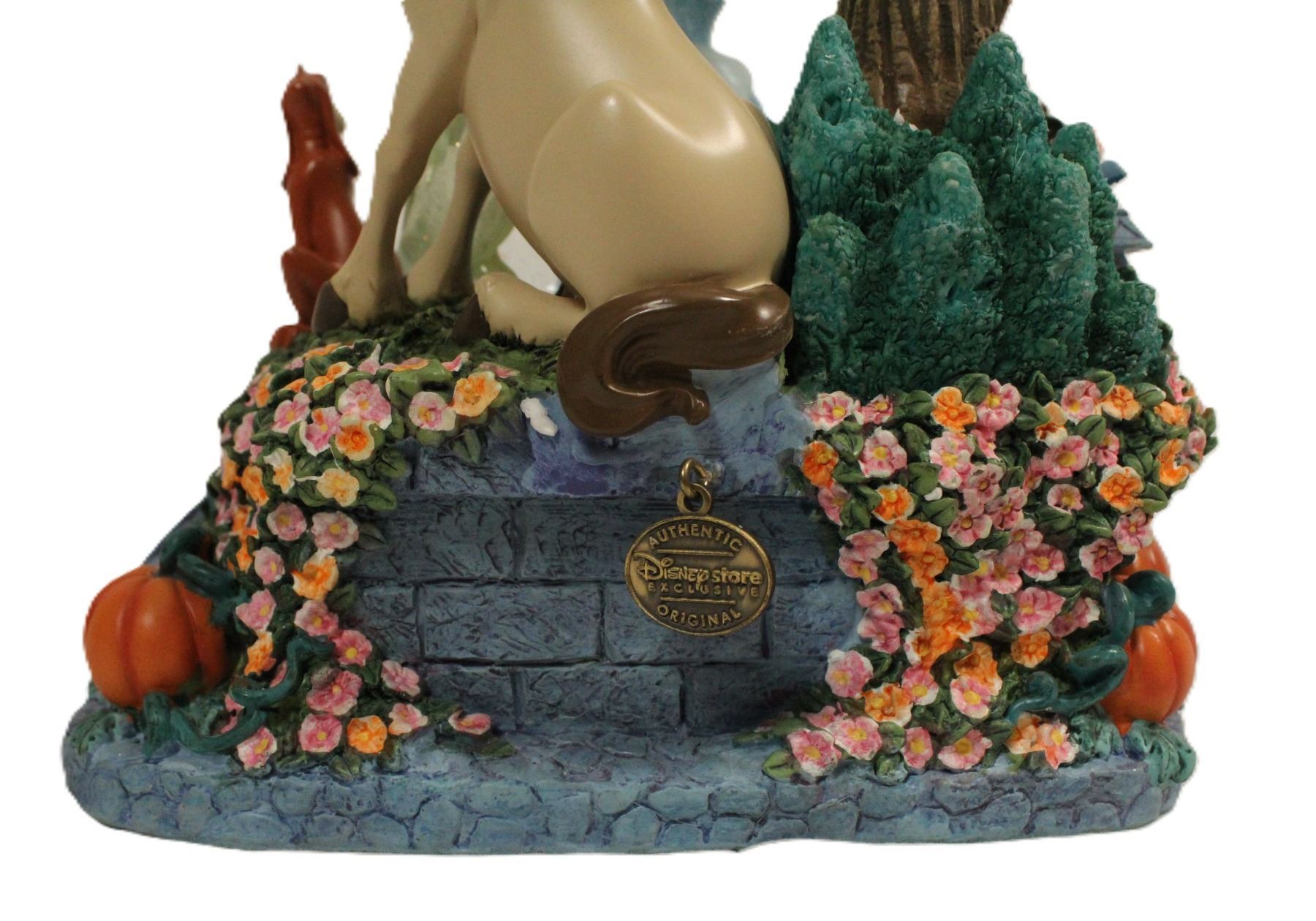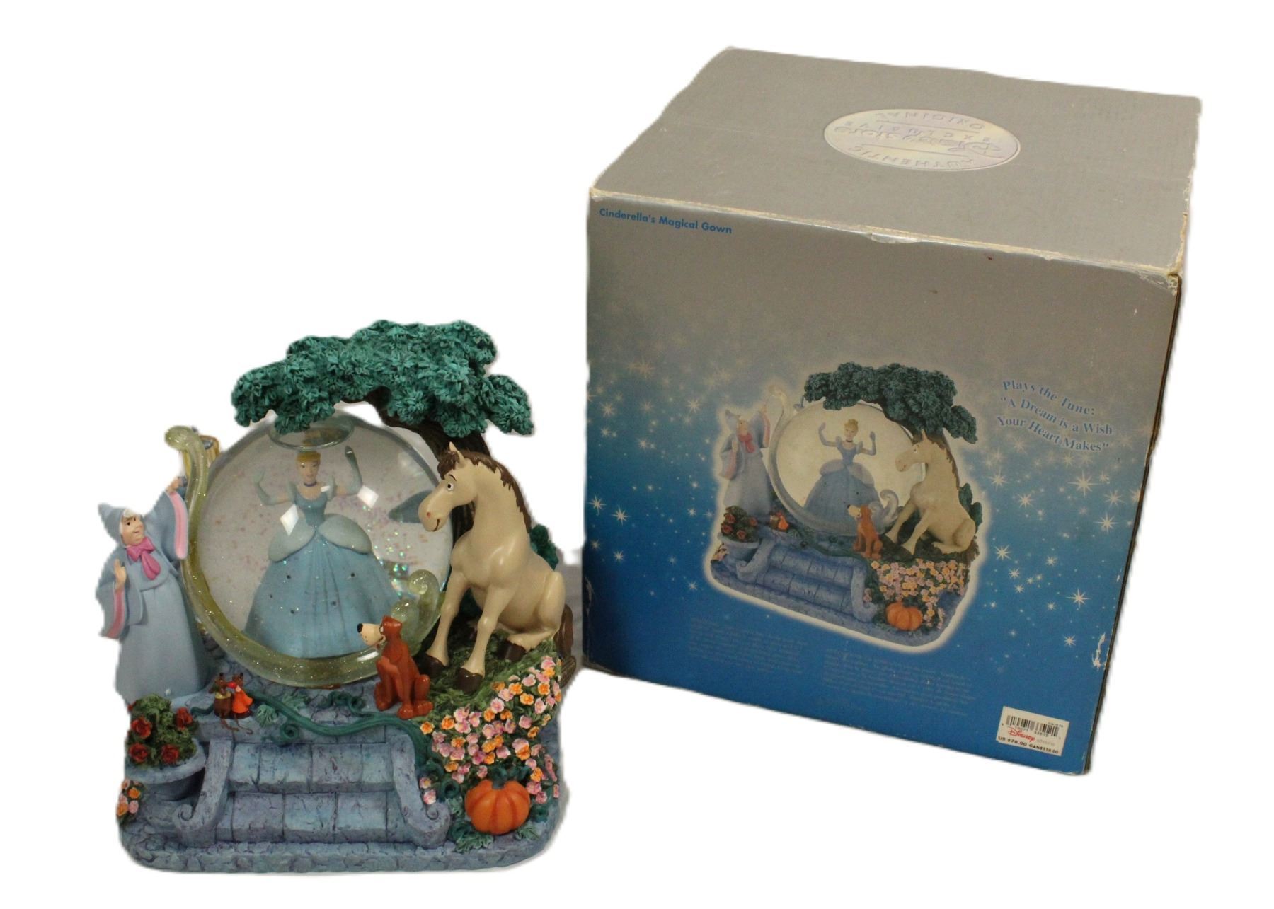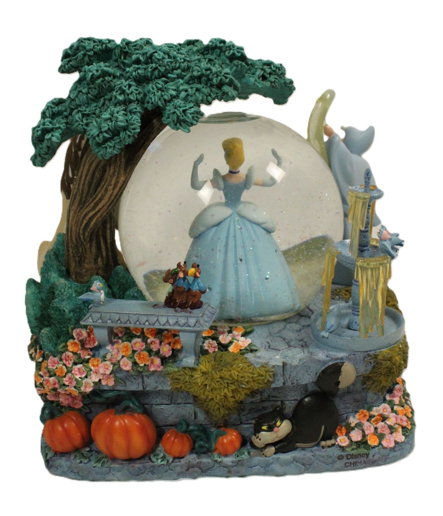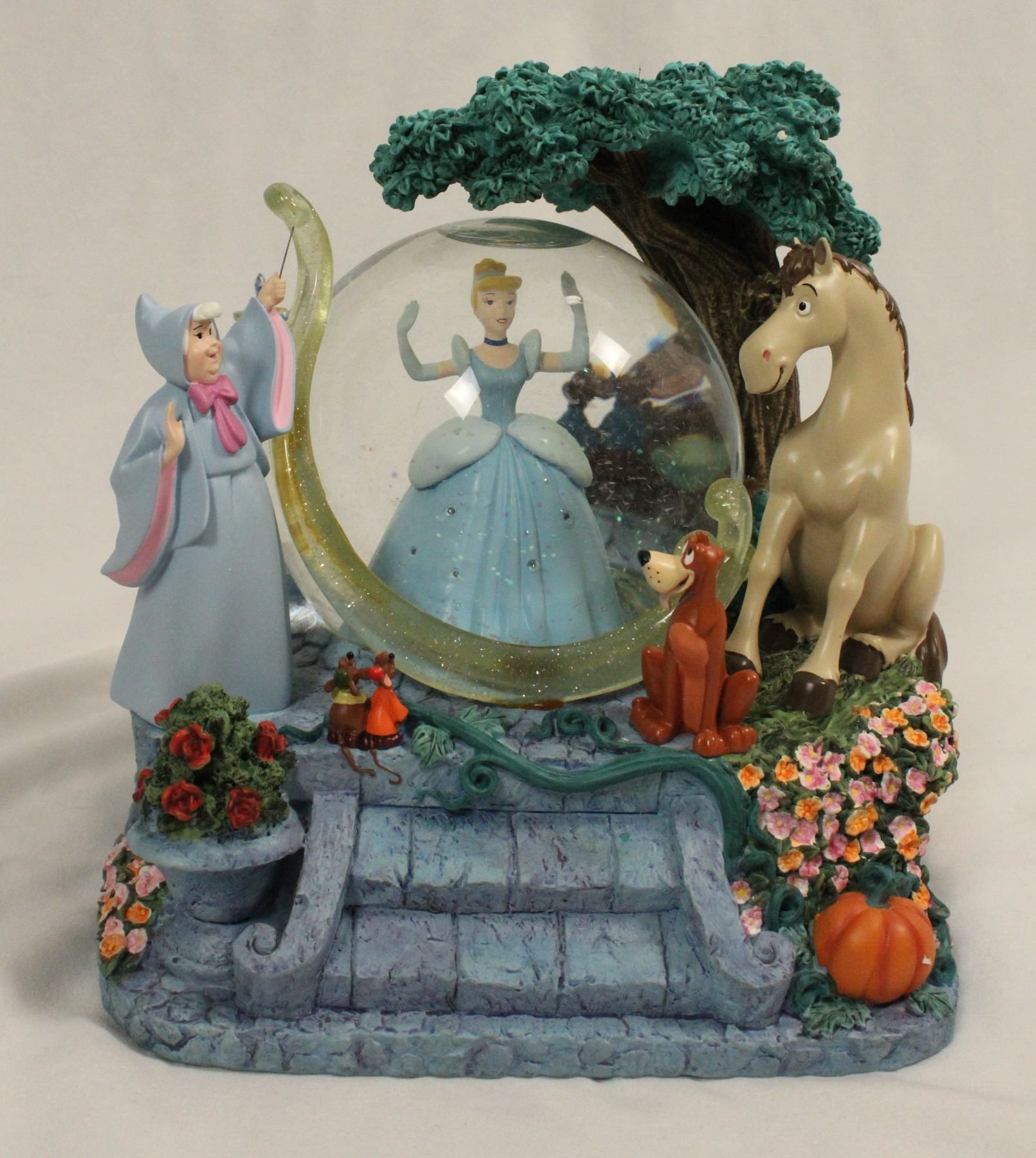 (Disney Store) This is a beautiful example of craftsmanship and storytelling. This snow globe acurately captures the scene where Cinderella gets transformed for the ball. Outside the globe you find Fairy Godmother, the horse, Bruno, Lucifer, Gus Gus, Jaq, Perla, and Suzy. The light works and Cinderella dances back and forth inside the snow globe. The music box plays perfectly.