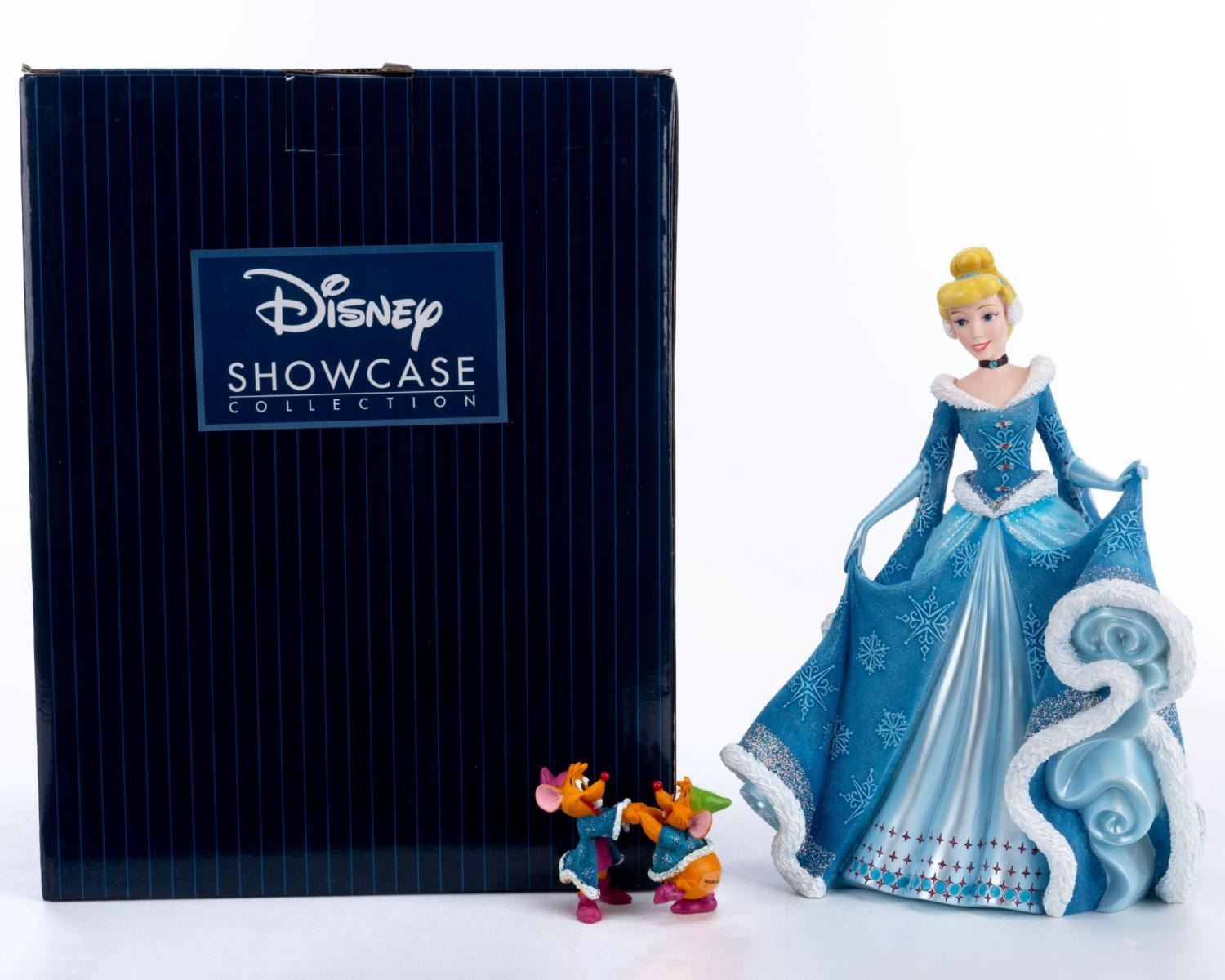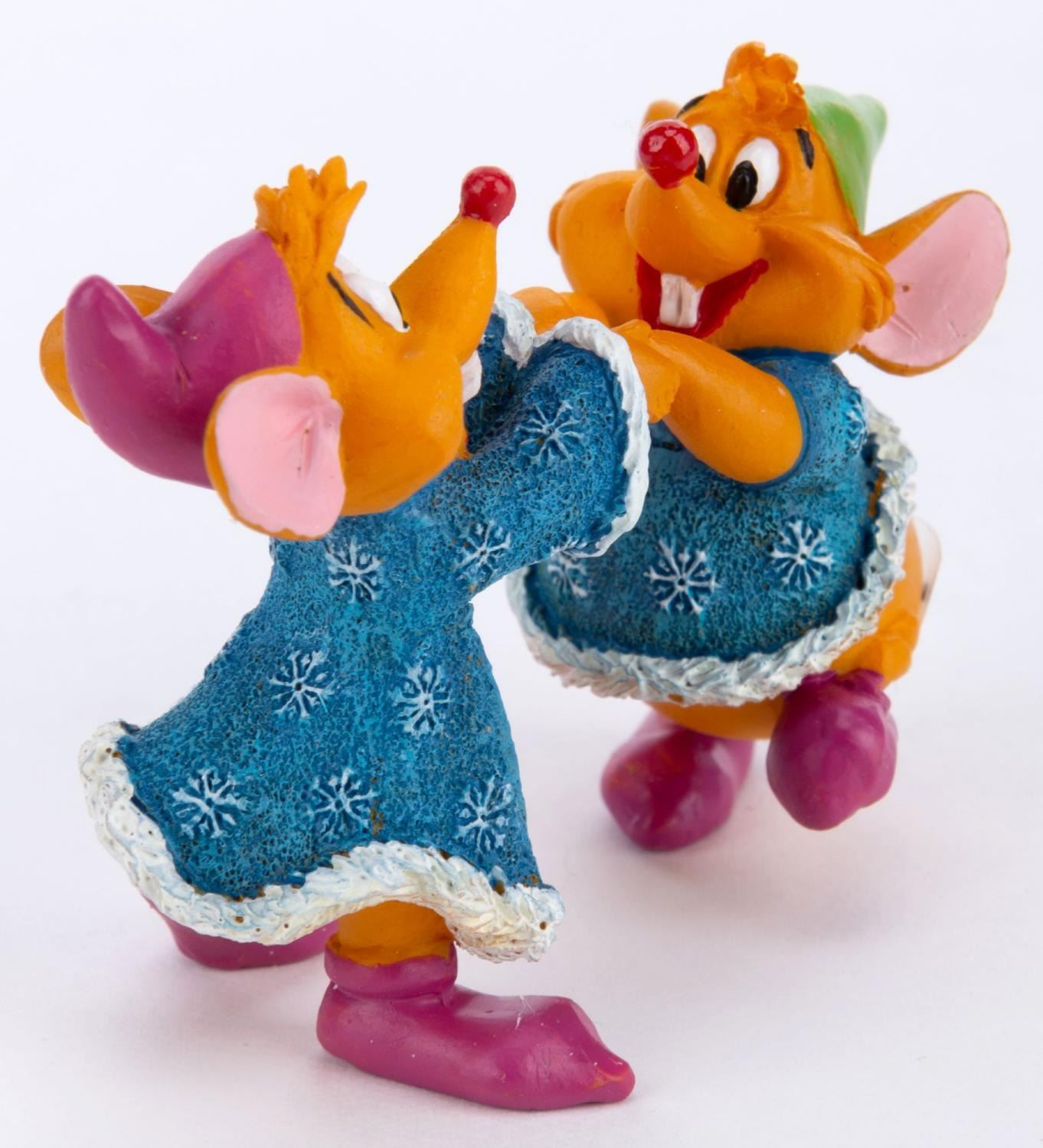(Enesco, 2019) A pair of original Disney Showcase Collection figurines of Cinderella, Gus, and Jaq from Walt Disney's animated classic "Cinderella.' The polyresin 'Couture de Force' series figurines feature the Princess and mice dressed in luxuriously festive attire. Measuring 6" x 4.75" and 8.25" tall and 2.5" x 1.25" and 2" tall, the figurines are in fine condition and come with the original 8" x 6.5" x 10.5" box.