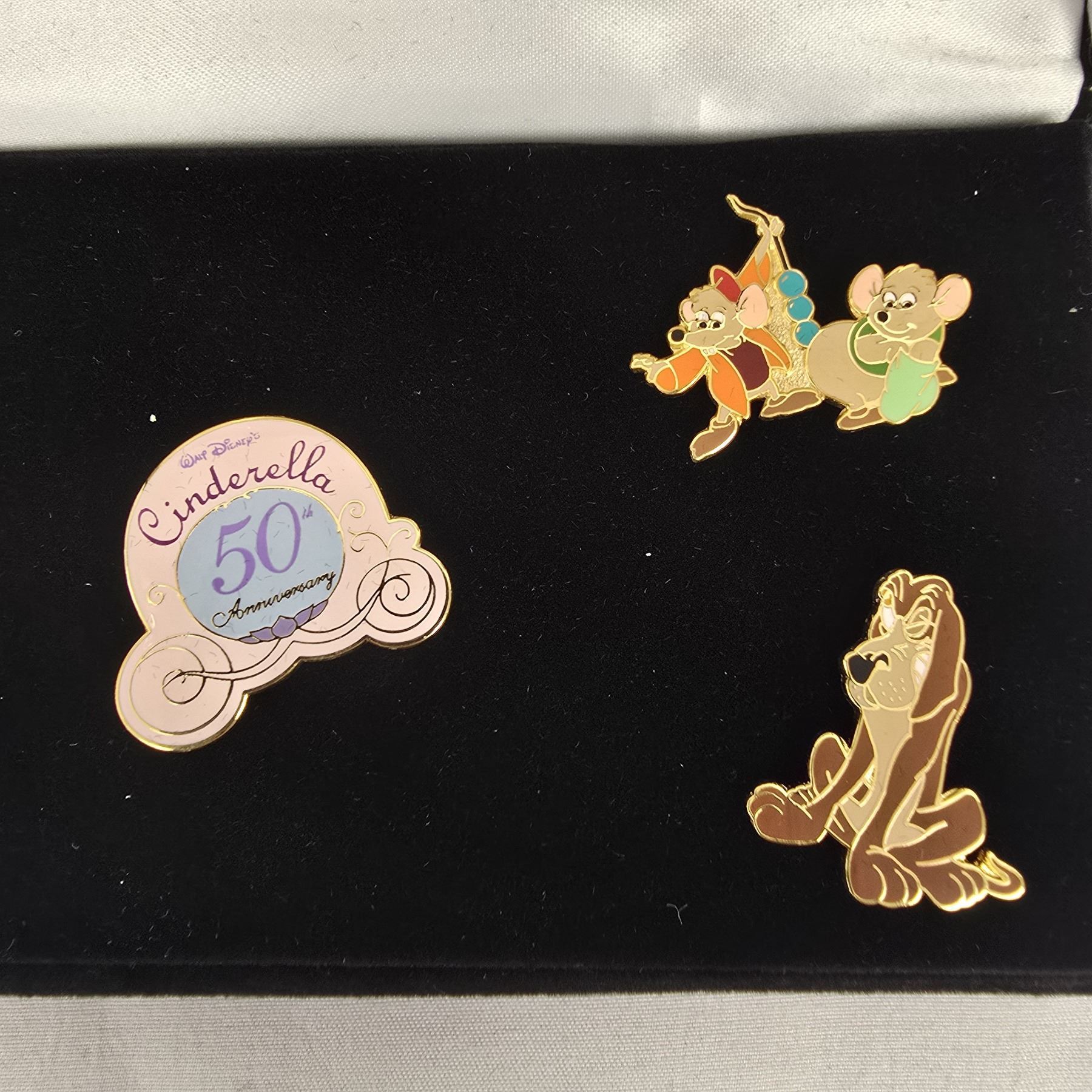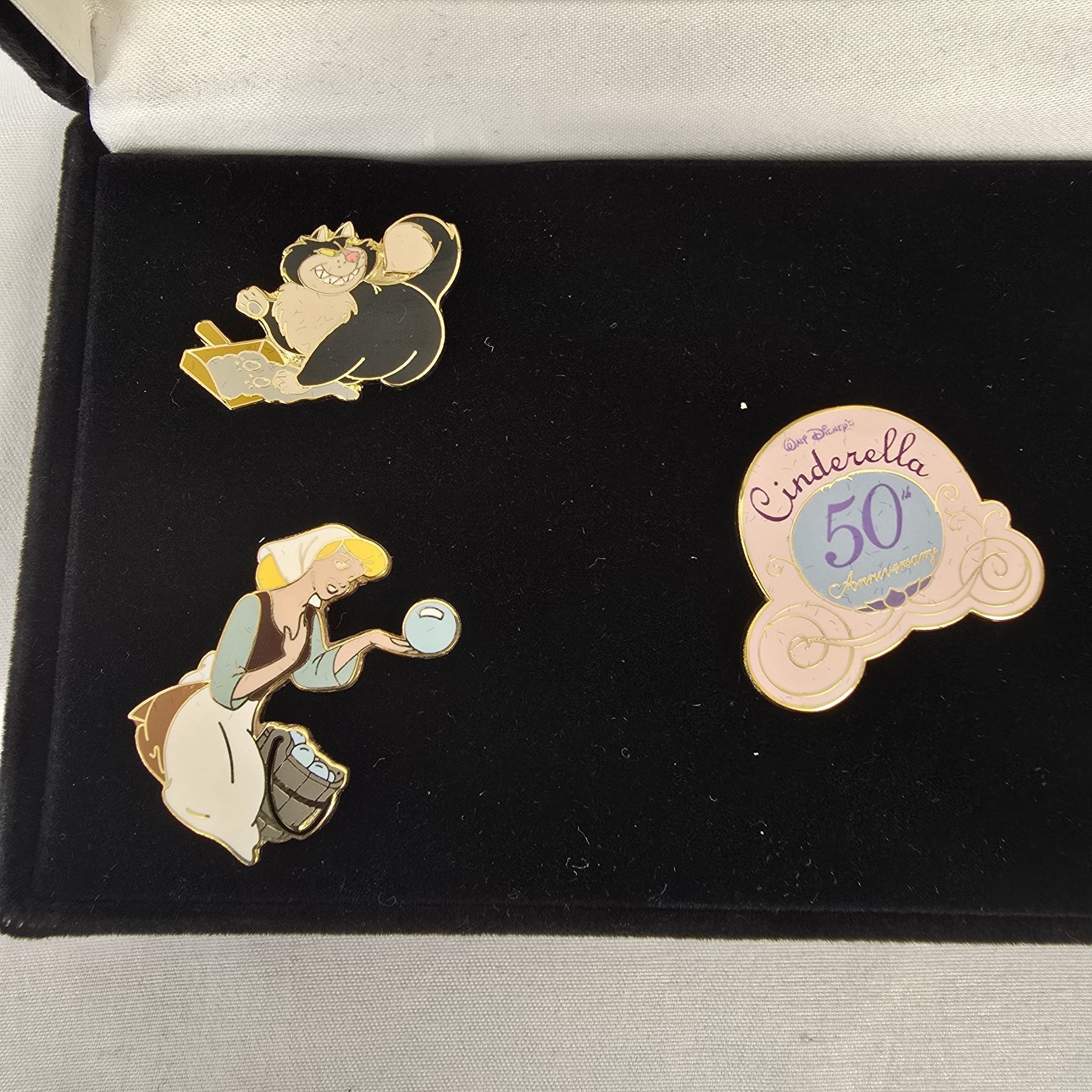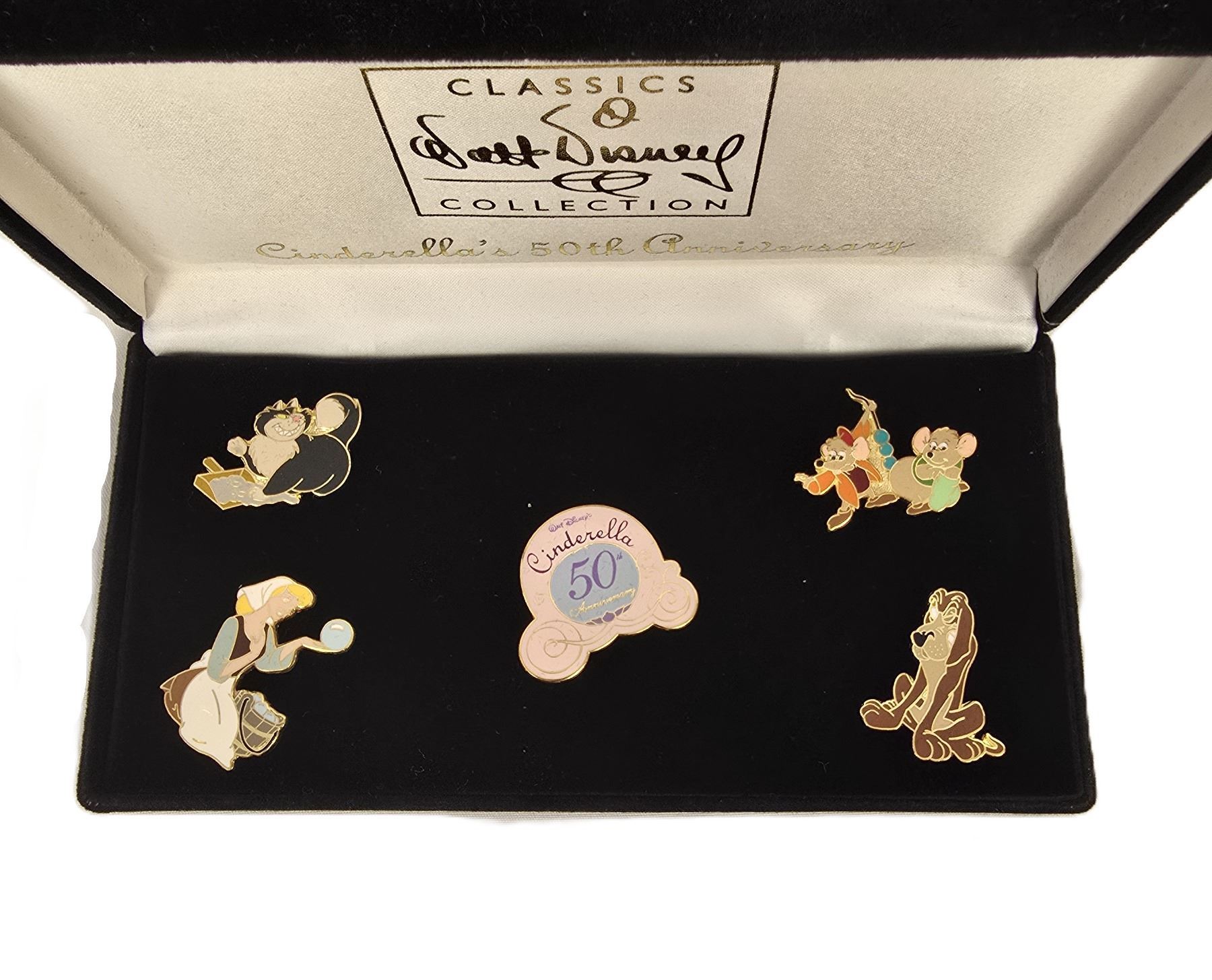 (WDCC, 2000) This is a 5 pin set honoring the 50th Anniversary of the classic animated feature film, Cinderella. It features a carraige logo pin, Lucifer, Gus Gus and Jaq, Bruno, and Cinderella. This beautiful pin set has been in storage since purchase and is in like new condition. It measures 6.75" x 3.5" x 1.25" and weighs 7 oz.