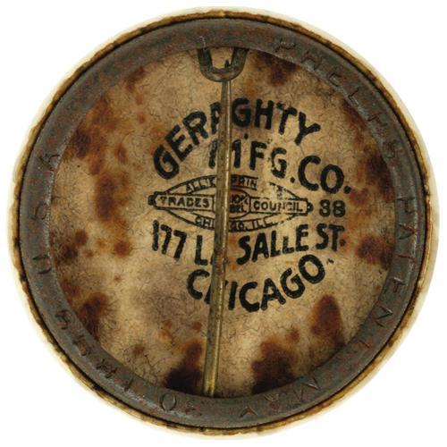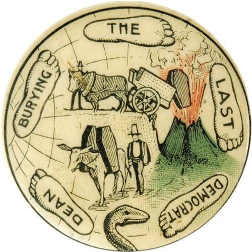 <B>An Unusual Circa 1896-1908 Era Political Cartoon Button.</B></I> We have never seen this design before, and frankly are at a loss to interpret it. A donkey and a cart are bearing coffins up onto a plateau, from which the cart is shown dumping a coffin into an active volcano, which spews it back out. Around the perimeter are footprints, bearing the words "Dean...burying...the...last...Democrat." Our research failed to turn up a likely identity for Dean. Perhaps one of our readers can help explain this button, and we will be happy to add the information to the web-site description. Excellent condition. <I>From the Norman Loewenstern Collection.</B></I>
