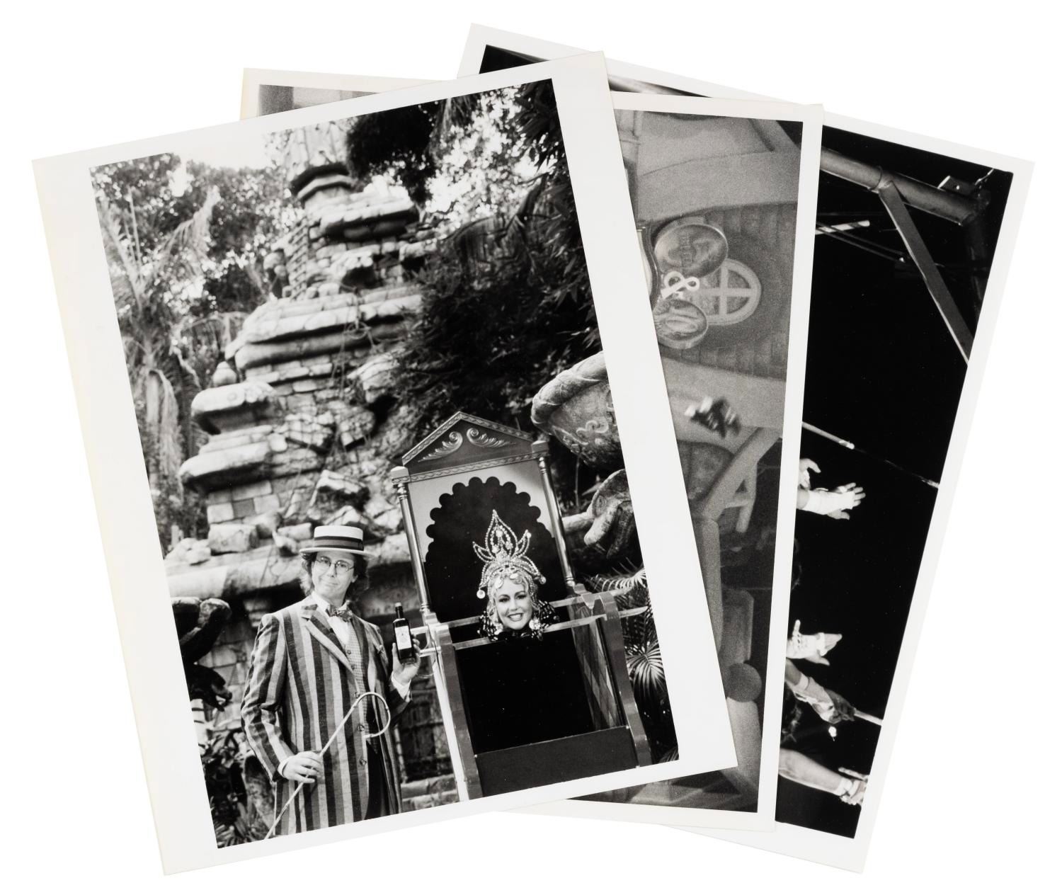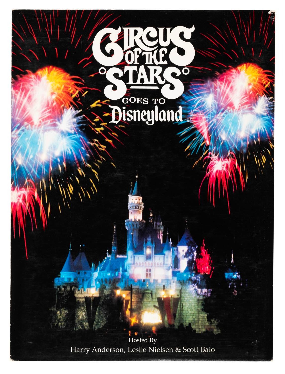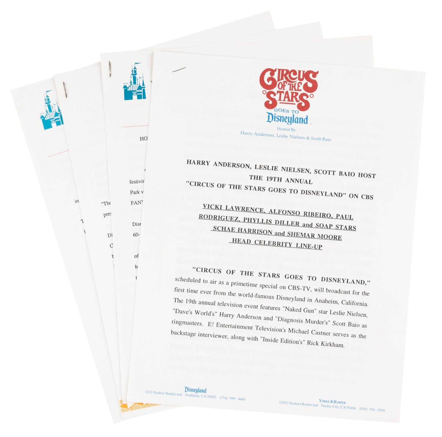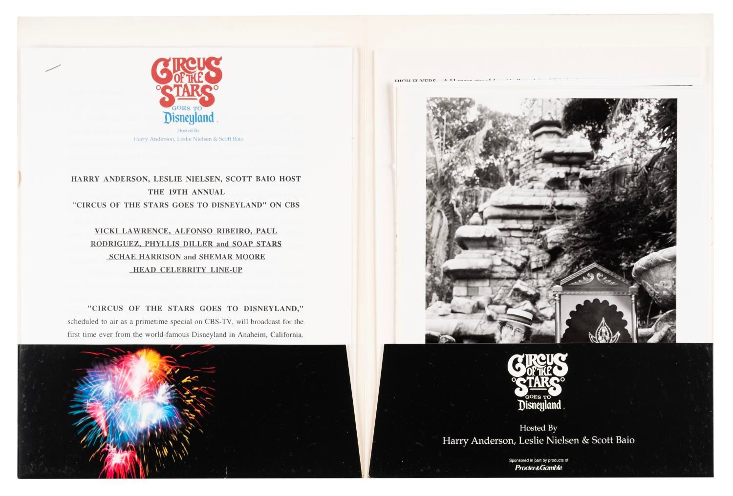 (CBS, 1994) A press kit for the television special “Circus of the Stars Goes to Disneyland” which aired on December 16, 1994. The special was hosted by Leslie Nielsen, Harry Anderson, and Scott Baio, with sequences filmed in Disneyland Park. The press kit contains three 8” x 10” publicity photos, and press materials for the show, The Lion King Celebration, and the soon-to-open Indiana Jones Adventure. Measuring 9” x 12”, the press kit is in very good condition with the folder in good condition showing typical edge wear.