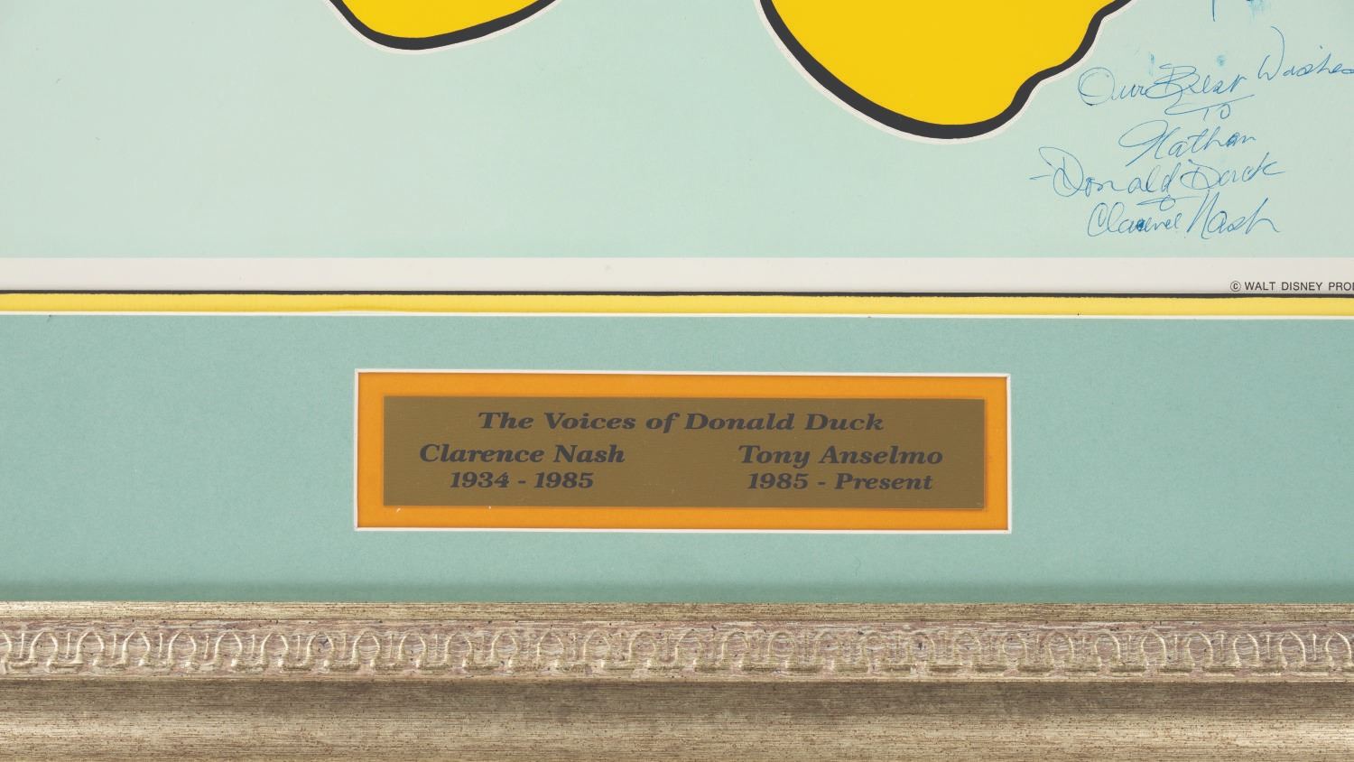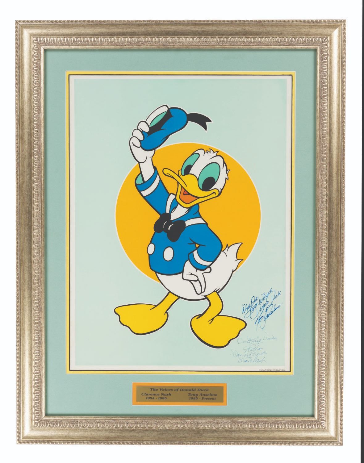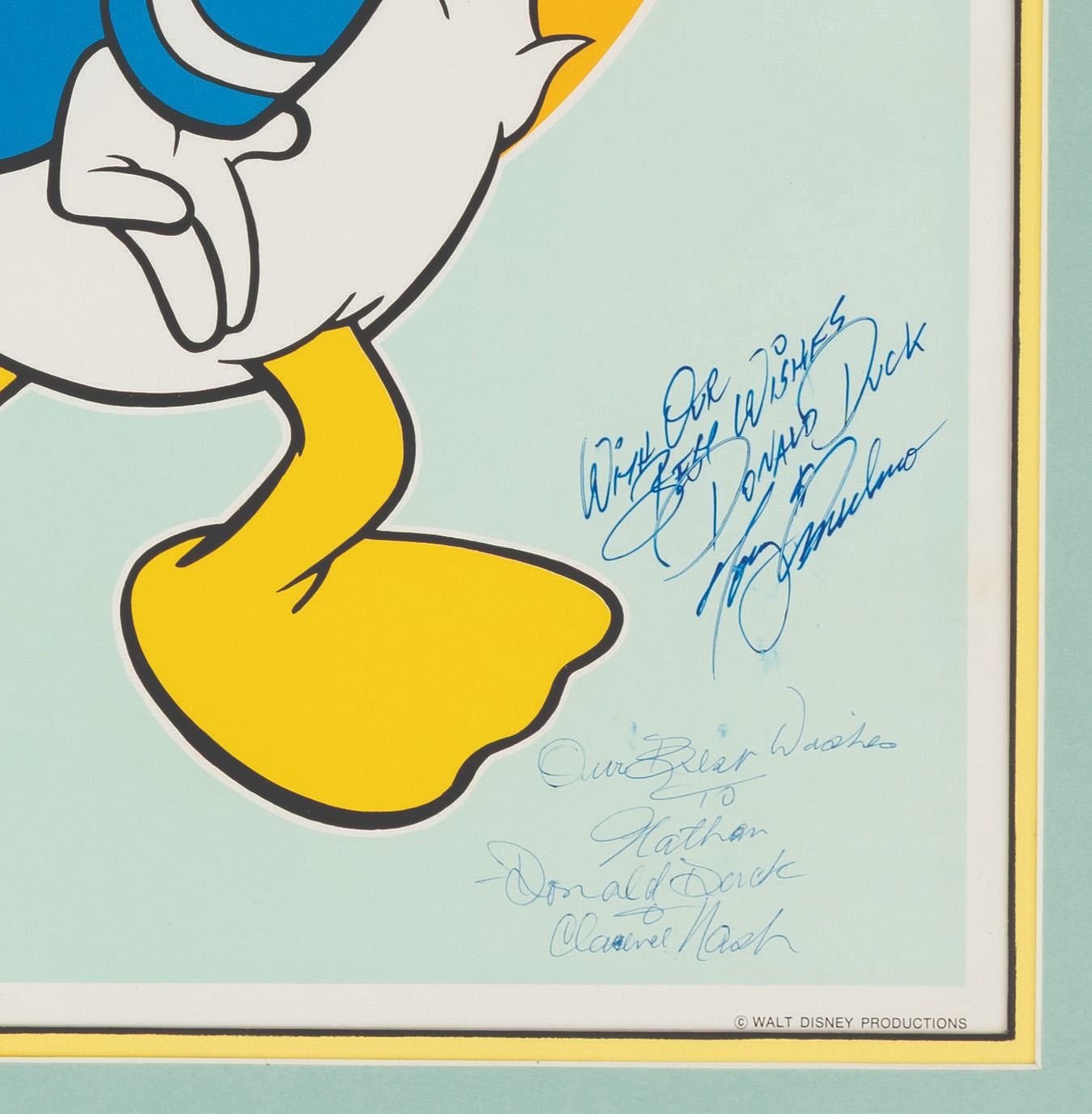 (Disney, 1980s) A print of Donald Duck signed by Clarence Nash and Tony Anselmo, the character’s voices. Nash originated the role of Donald Duck in 1934 and trained Anselmo himself, who took over after Nash's passing in 1985. This framed print is signed with dedications by Nash in blue pen and Anselmo in blue marker. With a visible image of 17.75” x 23.75” in a 26.25” x 34” framed matte, the piece is in good condition with creases, smudging on the Anselmo dedication, light bleed from the hand-marked black matte border, and light wear to the frame.