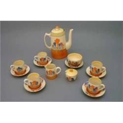 A Clarice Cliff 'Autumn Crocus' pattern part coffee service, comprising:- five coffee cans and saucers, a sugar bowl, milk jug, preserve pot and cover, coffee pot and separate saucer, painted in colours, printed factory mark to underside. £800-1,200