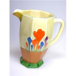 A Clarice Cliff Bizarre 'Crocus' pattern Athens Jug, the bellied octagonal shape painted with the flowers growing above a brown band and the green foot, printed marks and moulded shape number 30, 18cm high £250-300