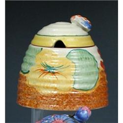 A Clarice Cliff Bizarre 'Nasturtium' pattern beehive honey pot and cover, the latter with blue winged orange beaded bee knop, the rope moulded sides painted with flowers and brown sponged soil, printed marks, 9.5cm high (R) (2) £280-340