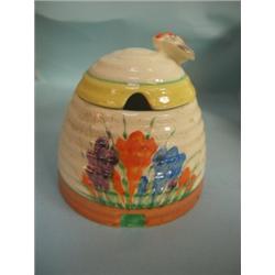 A Clarice Cliff, Newport Pottery, Crocus pattern honey pot beehive, 4"...