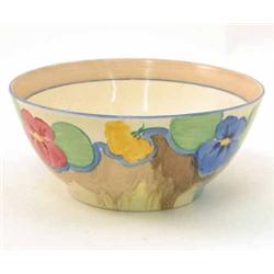 A Clarice Cliff 'Pansies' pattern fruit bowl, decorated with painted flowers and mottled design on a cream ground, printed Bizarre mark, 8.5ins £200-250