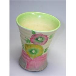 A Clarice Cliff 'Viscaria' pattern vase, the waisted cylindrical shape horizontally ribbed and painted with stylised pink, green and yellow daisies, printed marks and shape number 572, 10cm high £150-200