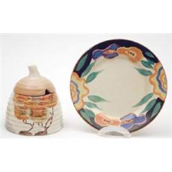 A Clarice Cliff bee hive honey pot in the Rhodanthe pattern (replacement lid) and a Garland patte...