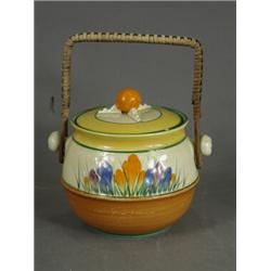 A Clarice Cliff crocus pattern biscuit barrel and lid with a wicker swing handle, base impressed...