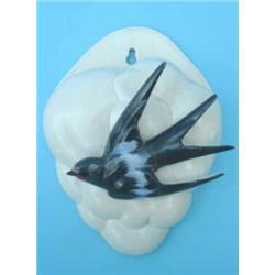 A Clarice Cliff slip-moulded wall pocket, with applied swallow against an off-white background, p...