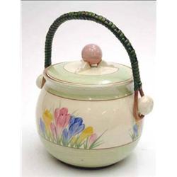 A Clarice Cliff spring crocus pattern biscuit barrel and cover with green stained wicker handle, 6.25ins £150-200