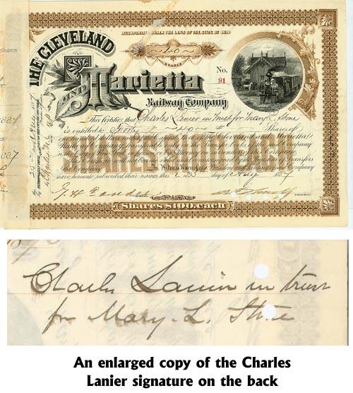 1887, Ohio. Stock certificate for 100 shares of the Cleveland and Marietta Railway Company. Brown/Black. Engraved vignette of a steam locomotive. Issued to and signed on verso "in trust for A.C. Lanier by CHARLES LANIER (b. 1837). Capitalist. Lanier inherited his interest in the banking house of Winslow, Lanier & Co. from his father, J. F. D. Lanier. He served as a director of numerous railroads, Western Union Telegraph and many other companies. "One of the most capable bankers and businessmen . ." in New York. Punch cancelled and fine.