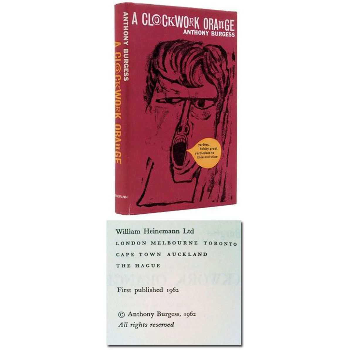Rare first edition, first printing of ''A Clockwork Orange'' by Anthony Burgess. Published by Heinemann: London: 1962. First printing dustjacket shows the 16s price and wide flaps, as called for. Both dustjacket and book are in remarkably near fine condition; dustjacket's deep purple-red color is still bright and shows only the faintest chipping on the head of the spine. Black clothed book retains sharp gilt lettering and is only slightly cocked. This original first edition copy of Burgess' landmark novel concludes in its final chapter with the protagonist Alex making a moral choice to forgo violence. It is said that Burgess regretted allowing the American edition to omit the last chapter and considered the movie by Stanley Kubrick ''deeply flawed'' for its omission. This original true English first edition retains the 21st chapter as Burgess intended. A near fine copy of an important 20th century novel.