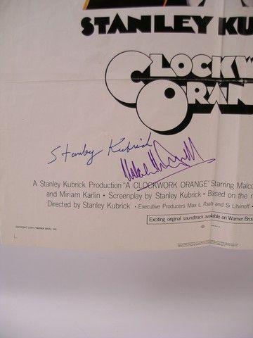 Stanley Kubrick followed up his grand epic "2001: A Space Odyssey", with a smaller budget, but much more controversial masterpiece "A Clockwork Orange" (1971). At first rate "X", it tore through the world's theaters causing both adulation and repulsion. But in fact it is a masterpiece, which has stood the test of time and shows up on lists of the top 50 greatest movies. Besides Kubrick's genius in bringing Anthony Burgess' prophetic and apocalyptic future tone poem on sex, drugs, ultra violence and free will to the screen, there was the star himself, Malcolm McDowell who, as Alex, created the greatest anti-hero ever to grace the screen. This is a full size theatrical poster from the "R" rated version of the film. What makes it a treasured memorabilia is that the poster is signed by both Stanley Kubrick and Malcolm McDowell. Kubrick especially was well known for rarely giving autographs, or signing anything connected with his work. The poster was signed by Kubrick for the Songwriter's Hall of Fame Museum, which was founded by legendary songwriter Sammy Cahn. Because Kubrick was a huge fan of Cahn's work he gladly signed the poster, and included a personal note with the poster. This includes a copy of that original extremely rare handwritten note by Stanley Kubrick to Arte Kern, nephew of Sammy Cahn, and chief curator of the museum which reads: "Sorry to be so late replying. Sure I'll sign what you have. Best Stanley. PS I have never met Sammy but I am a great, great admirer!" The poster itself has fold marks, and shows signs of wear and some tape on the backside. Approx 41"x27".