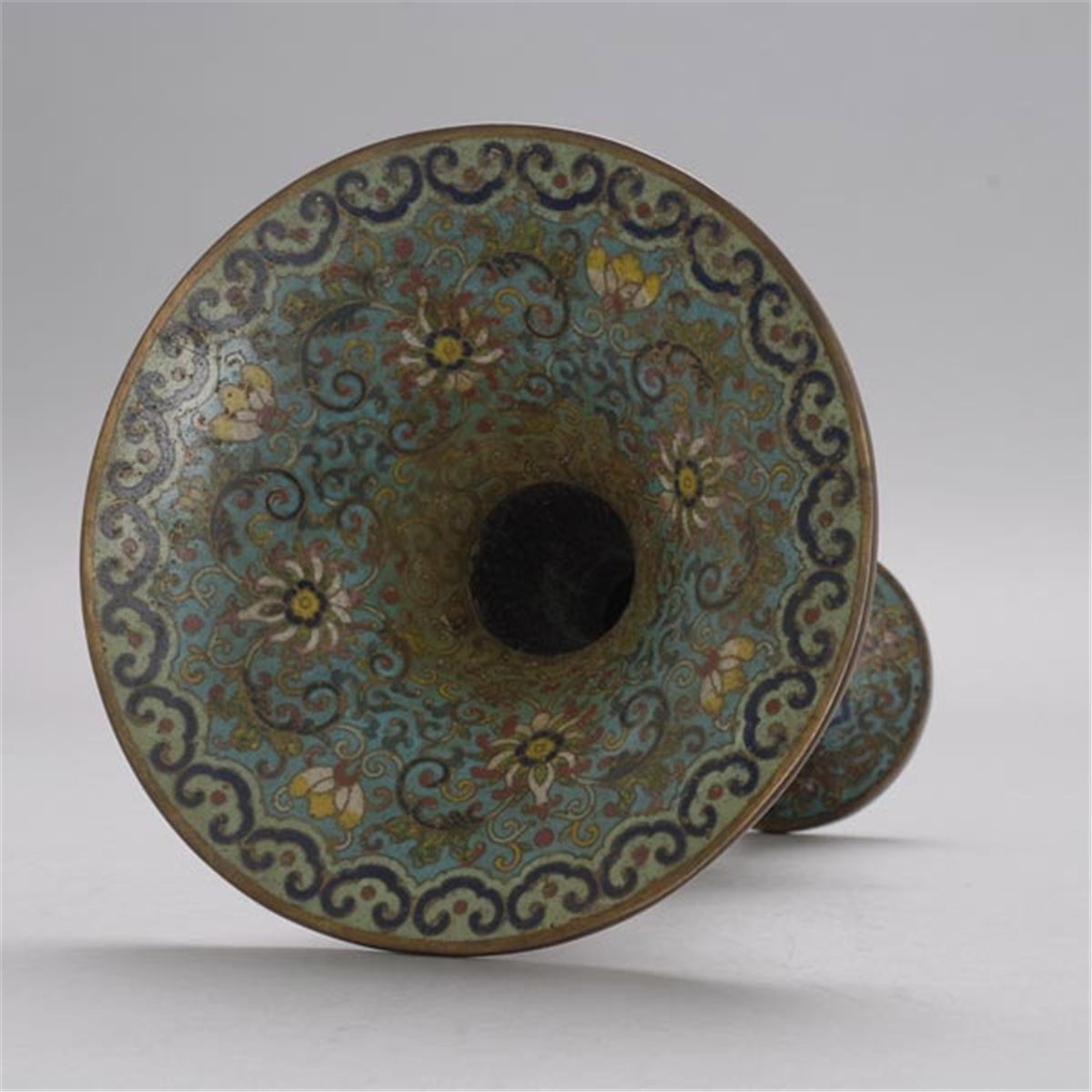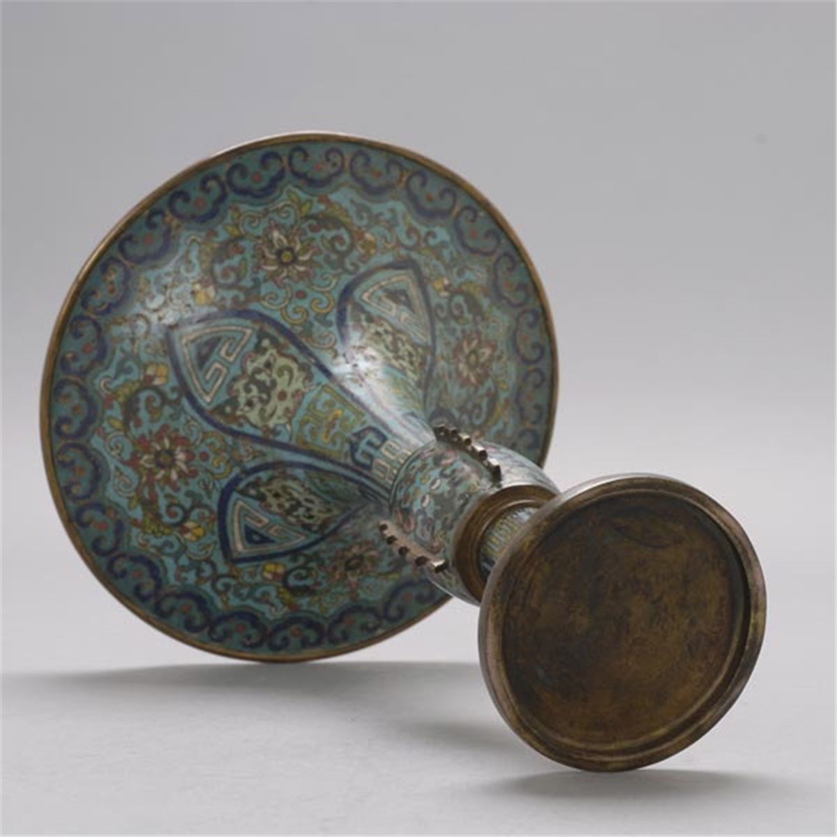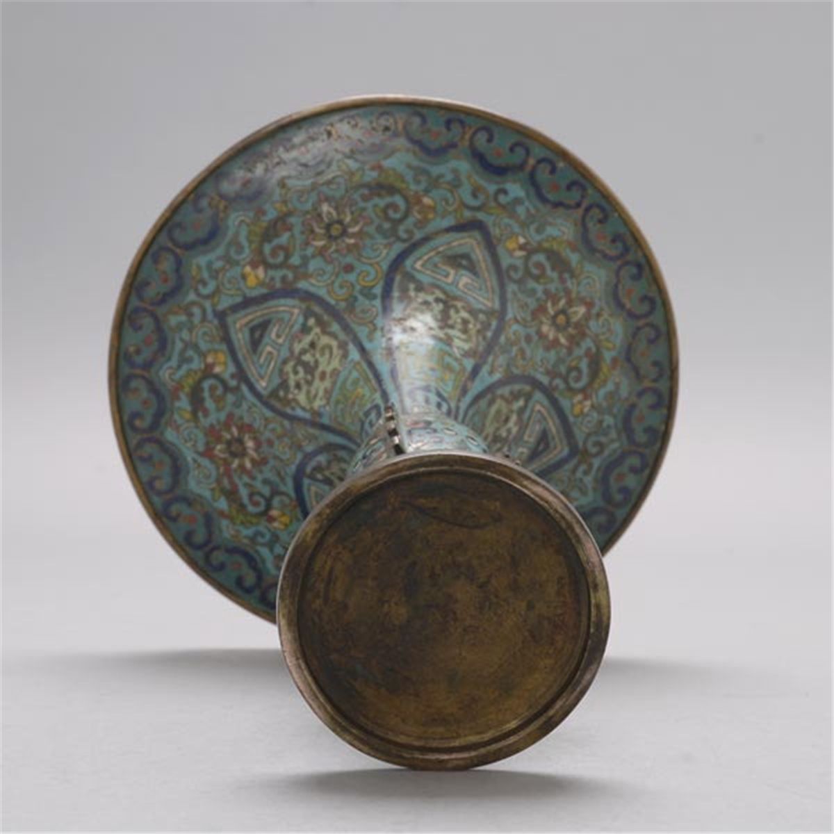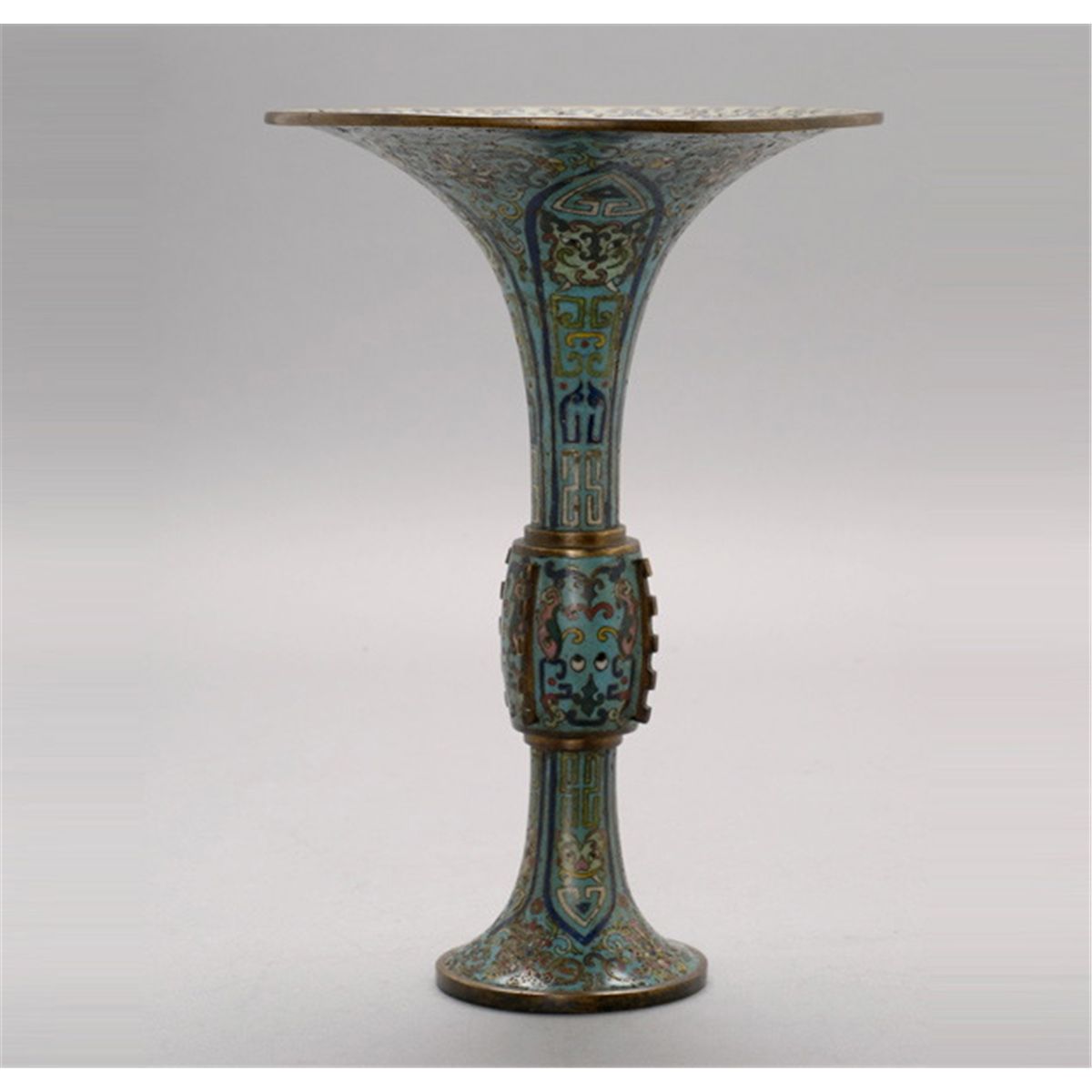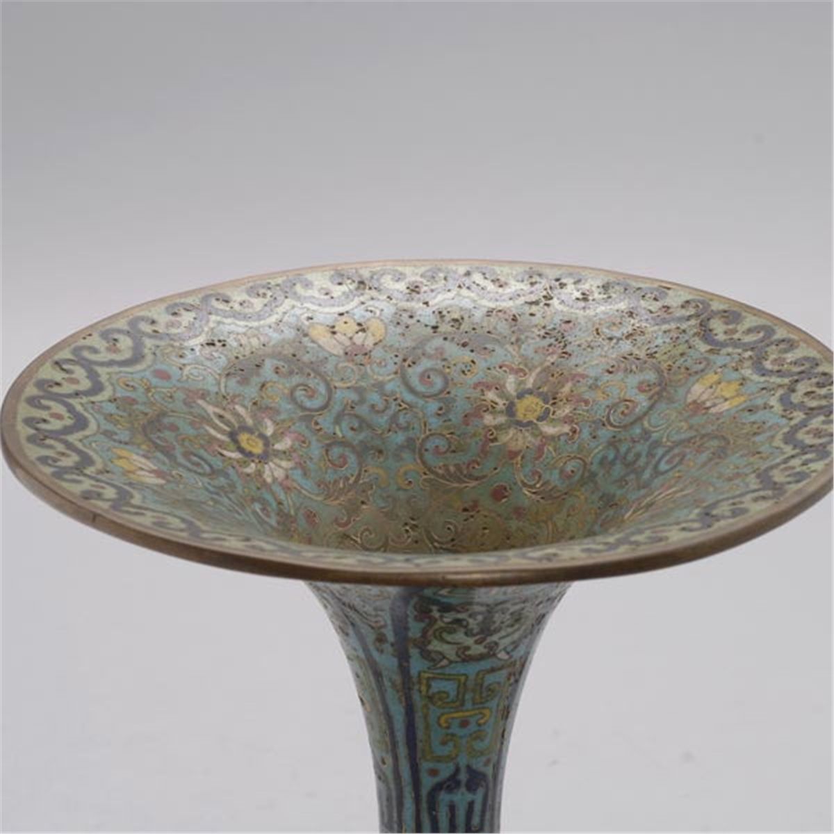A Cloisonné-Enameled 'Gu' Form Vase, Inspired by an ancient bronze form, the spreading base decorated with stylized scrollwork, the knobbed midsection divided into four panels by vertical flanges, the protruding central section also with stylized scrollwork, between a row of blades on the tall flaring neck and base, against a turquoise ground with lotus scroll. Late Qing/Republic Period, Height: 11 3/4 inches (29.8 cm) [Losses to enamel, wear to gilding. This condition report states major condition issues only.]