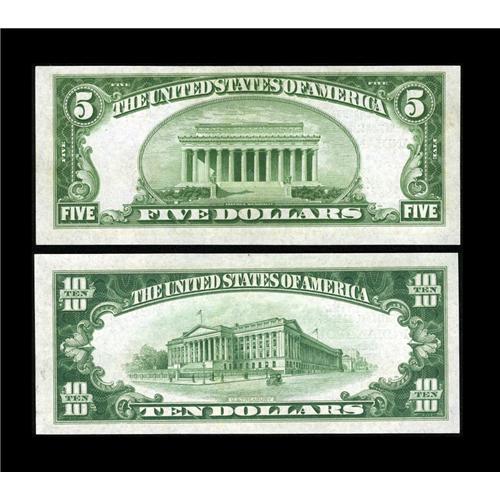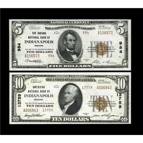 <B>A Closely Matched Pair of the 1929 Series from the Hoosier State</B></I><BR>Indianapolis, IN - $5 1929 Ty. 2 The Indiana NB Ch. # 984 <B>Choice Crisp Uncirculated</B></I><BR>Indianapolis, IN - $10 1929 Ty. 2 American NB Ch. # 13759 <B>Choice Crisp Uncirculated</B></I>.<BR>Both of these notes enjoy pack fresh paper and would be unquestioned Gems but for minor centering issues.<BR><I>From The Bill and Kathy Stella Currency Collection</B></I><BR><BR><b>Shipping:</b> Coin/Currency (<a target="_blank" href="http://www.heritageauctions.com/common/shipping.php">view shipping information</a>)