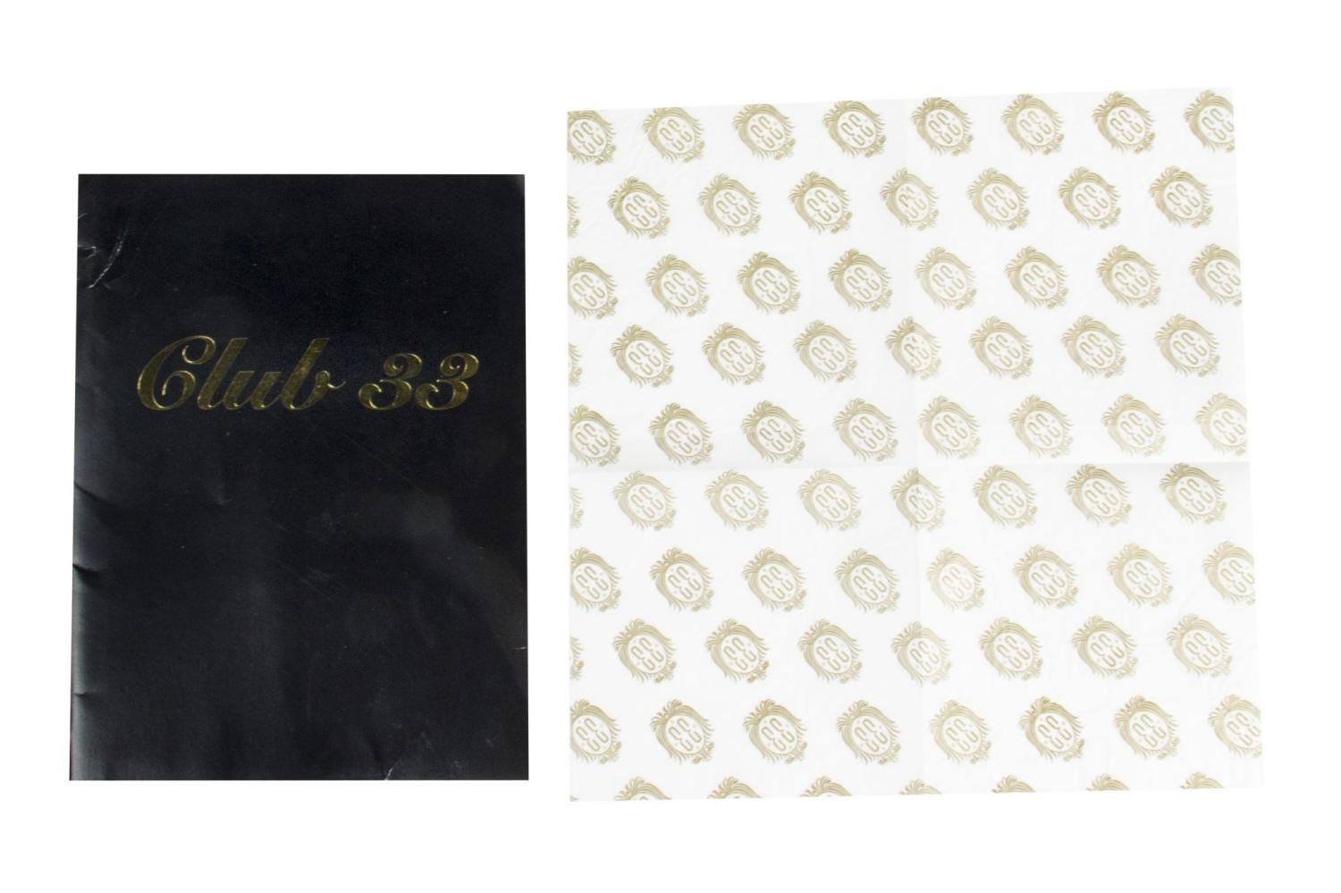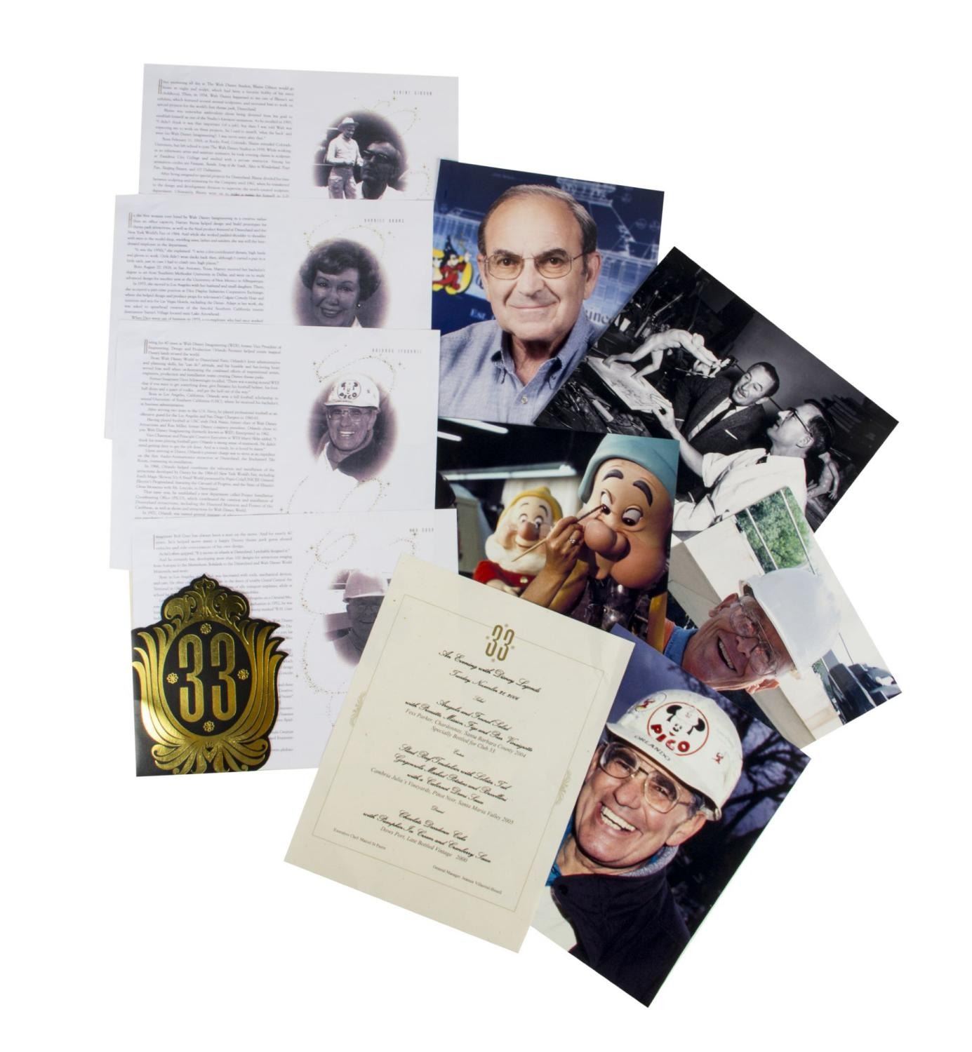 (Disneyland, 2006) A commemorative packet from a private "An Evening with Disney Legends" dinner event at Disneyland's exclusive "Club 33". The outer folder features the "Club 33" name on the front and has a large die-cut club logo inside the cover. Included in the folder is a dinner menu on "Club 33" stationery, (biographies of the Disney Legends at the event including Blaine Gibson, Bob Gurr, Harriet Burns, and Orlando Ferrante, and five high quality photos of those Disney Legends as well as Marty Sklar. The folder measures 12"x9" and the photos measure 8"x10". The condition is very good overall with creasing around the edges of the folder. Additionally, a thin piece of "Club 33" logo tissue paper is included.