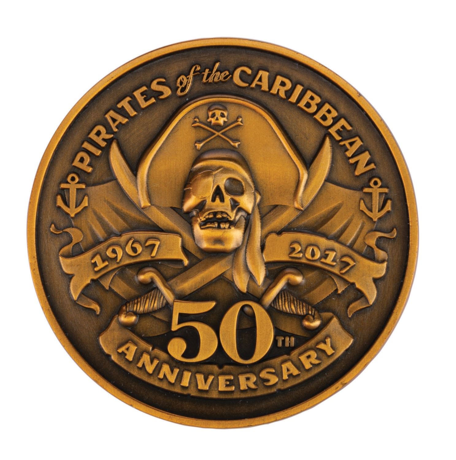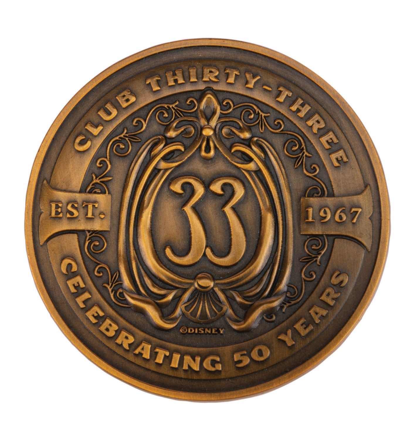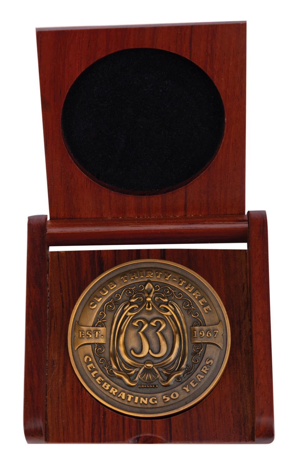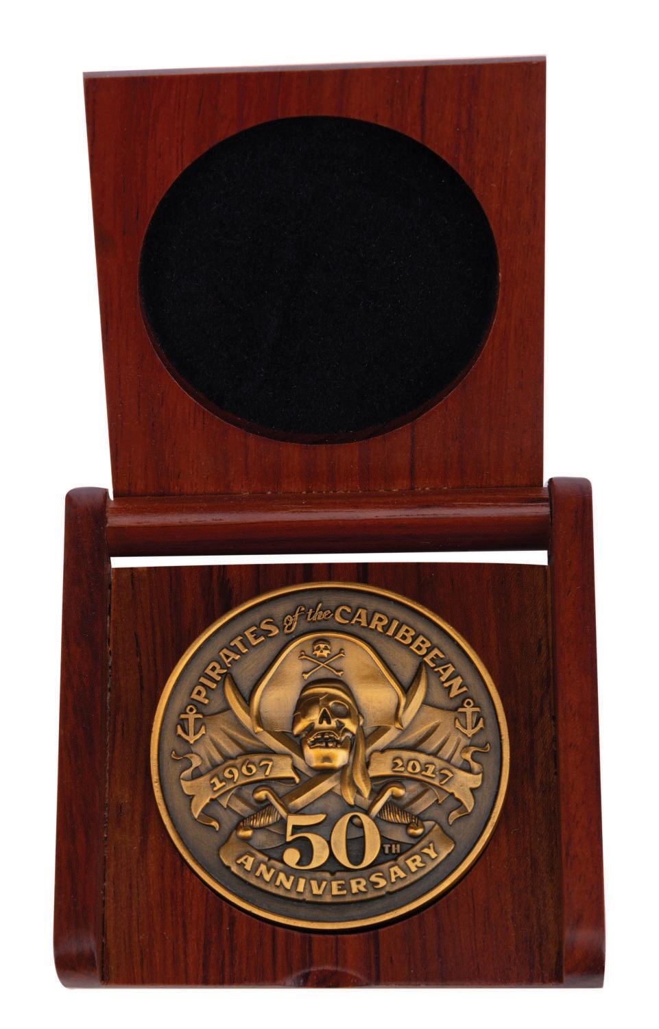 (Disneyland, 2017) A member exclusive Club 33 coin celebrating the 50th anniversary of both the renowned Club in New Orleans Square, and the original Pirates of the Caribbean attraction at Disneyland. Club members and their guests who attended the Club's 50th anniversary event each received one of these coins in a handsome wooden box. The coin measuring 2" in diameter and 3"x3" wooden box are both in fine condition.