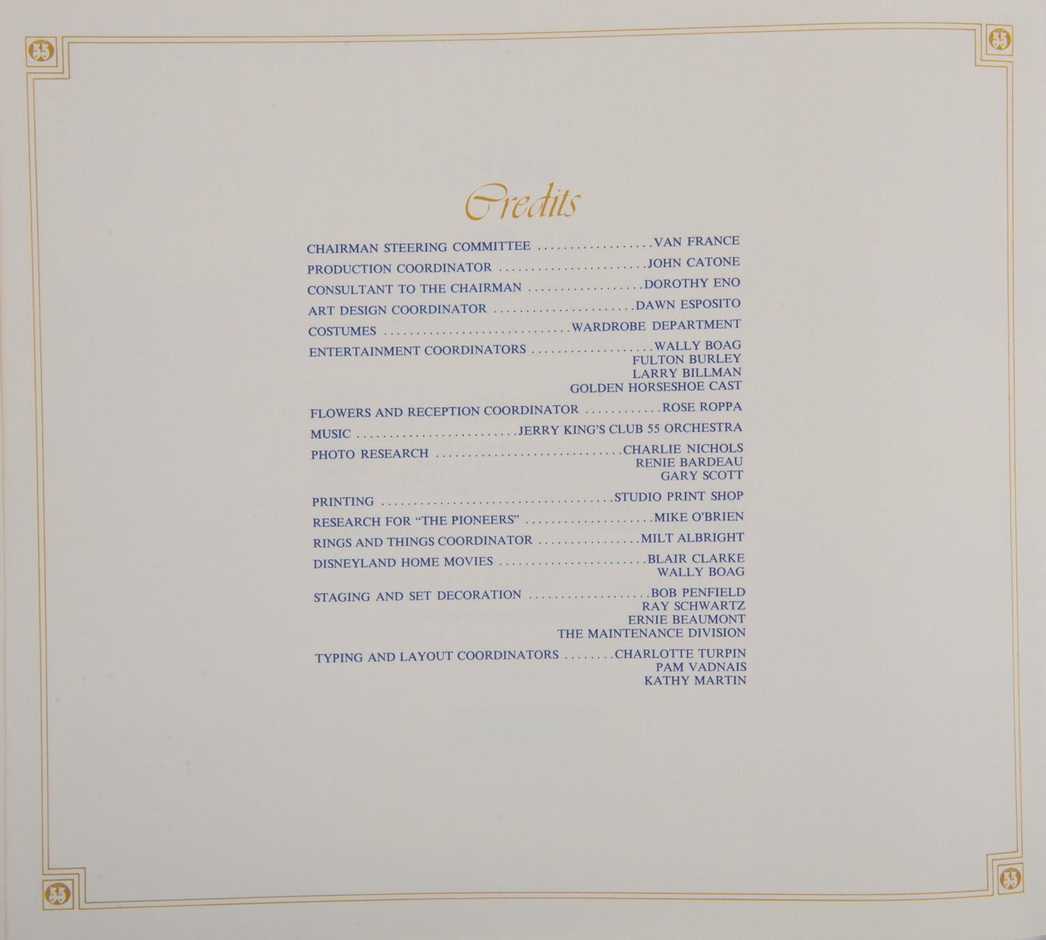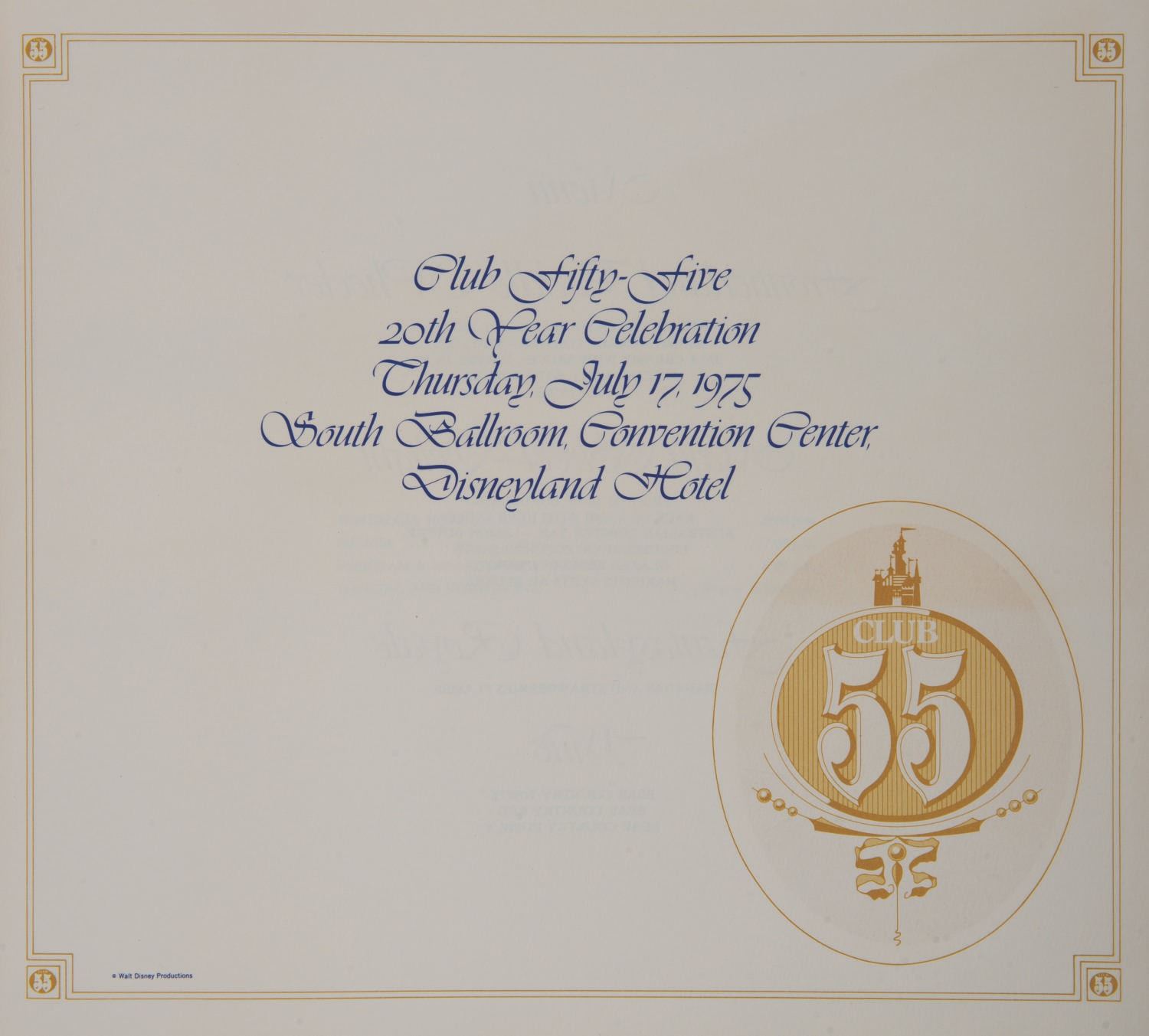 (Disneyland, 1975) A rare souvenir program of the 20th Year Celebration for Club 55, the Cast Members who worked at Disneyland Park when it opened in 1955. Measuring 11”x12.25”, the program is in fine condition.